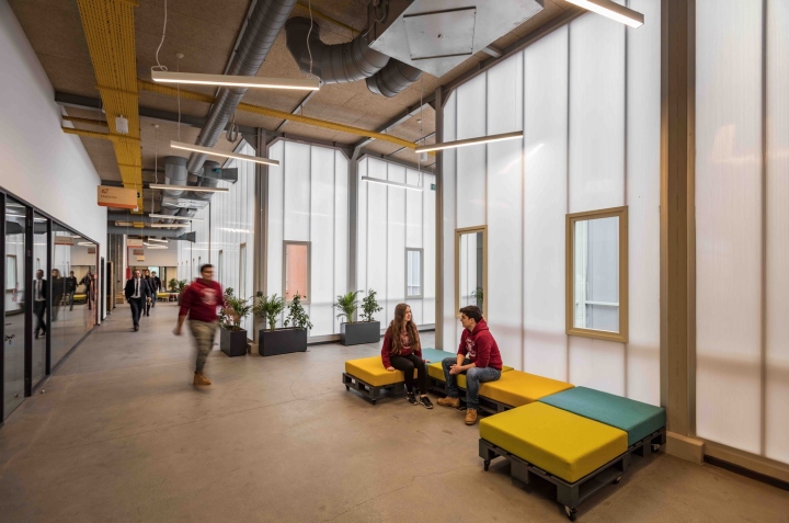 这种战略规划确保了结果是新颖的,独立于正式的设计元素。此外,这些不同区域的布局和邻近程度取决于日光需求、视觉隐私、隔音和基于角色的流通路径等参数。下一步,建筑系统的开发与多个技术专家密切同步,从而实现高性能和集成设计。天花板表面放置了生态木丝板,以减少混响并提高不同学习环境中的清晰度,同时实现能源效率目标。
