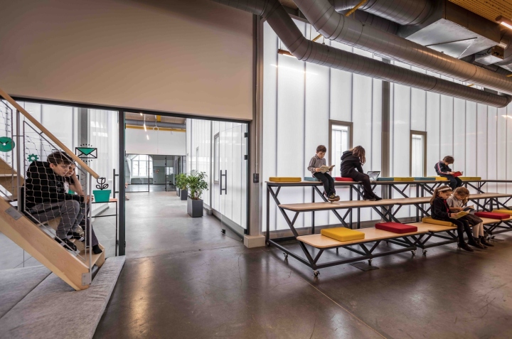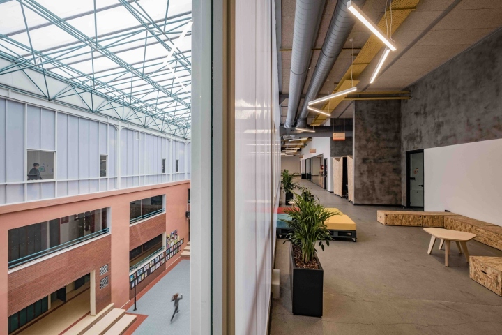 所有照明系统均指定为可调光低开尔文 LED,支持灵活学习,同时减少能源使用。从日光的角度来看,中央中庭覆盖着吸音、低能量的轻质聚碳板,为空间提供了充足的日光,而狭窄的窗户点缀在表面上,创造了不断变化的有利位置。机械系统的选择具有当地最高的效率等级,同时通过颜色将新鲜空气和排气系统分开,从而充当儿童的教育容器。