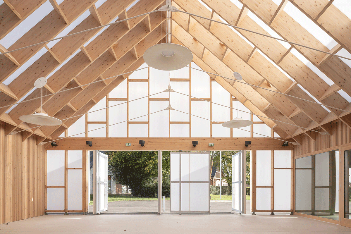 The new school takes place in the city center of Saint-Ouen-du-Tilleul next to the town hall and the multipurpose hall. The equipment sets over the entire width of the plot, parallel to the street “Rue de l’Eglise”. This layout allows children’s living spaces to be protected from external views, while opening generously onto the playground and the planted areas, offering to users places for living and teaching in relation with nature.