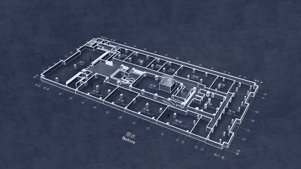 The original building represent the type of shopping mall that has a rigid rectangular column grids. When people walk inside, their sightline would be parallel to the storefront, making it difficult to be attracted by the goods inside the store.