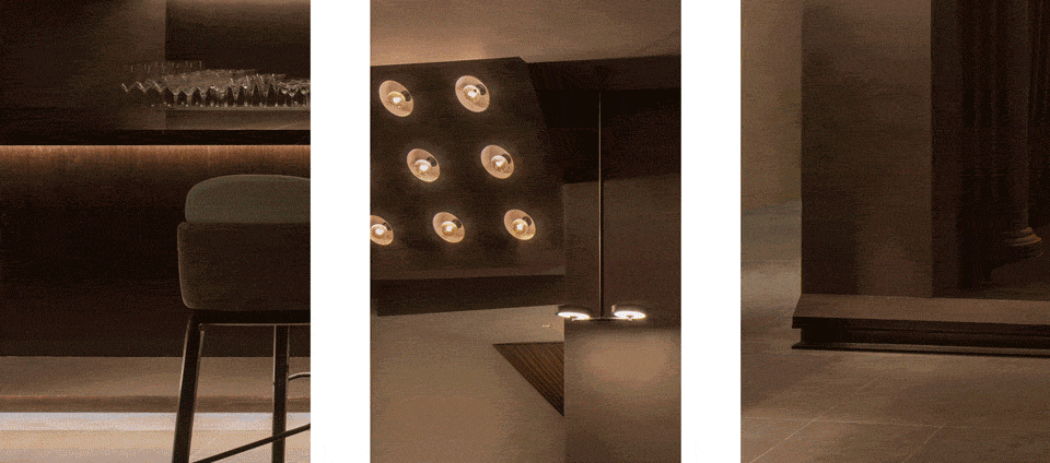 The meditative brown wall with mottled texture and the brown wood bar jointly constitute a nostalgic aesthetics. The lighting design blends warm yellow light color with faint visible wrinkled texture, thus giving a peaceful and flowing vitality under the relatively static background. The contrast of natural stone against the light echoes the playful tone and penetrates the unique Opera spirit.