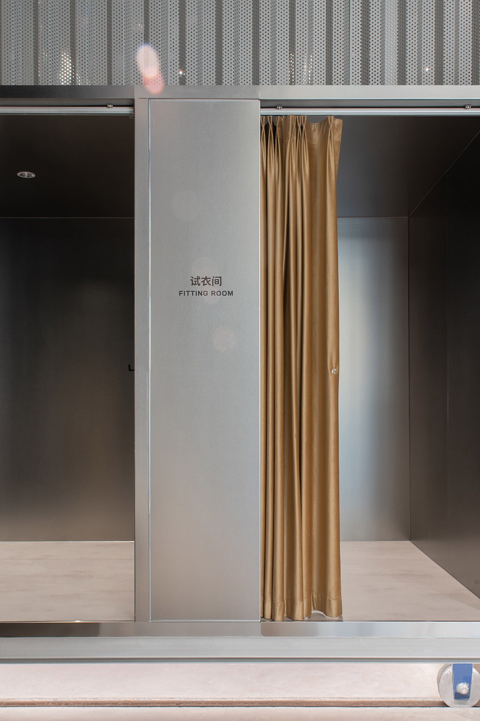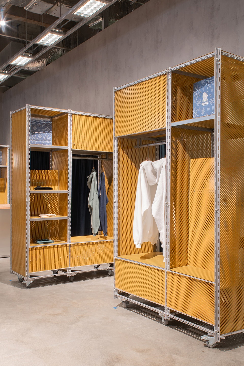 服装展架的开发一方面要匹配品牌气质,同时还需兼具功能性。每一个展架为一个单元,服装、配饰及收纳都集成于此,通过地面的限位标识给日常运营提供便利性。