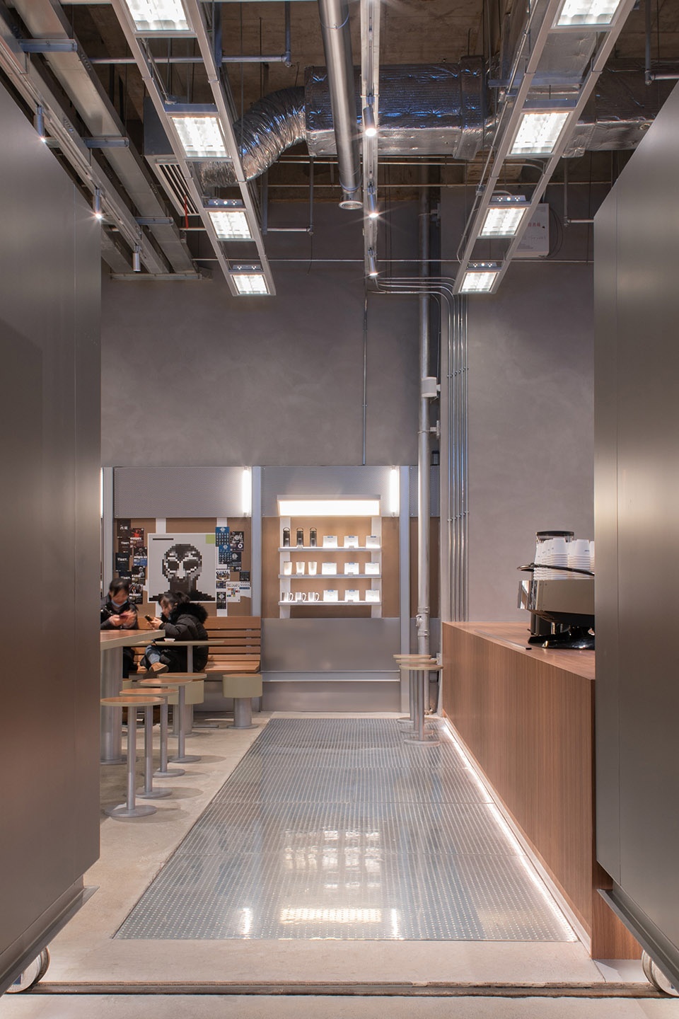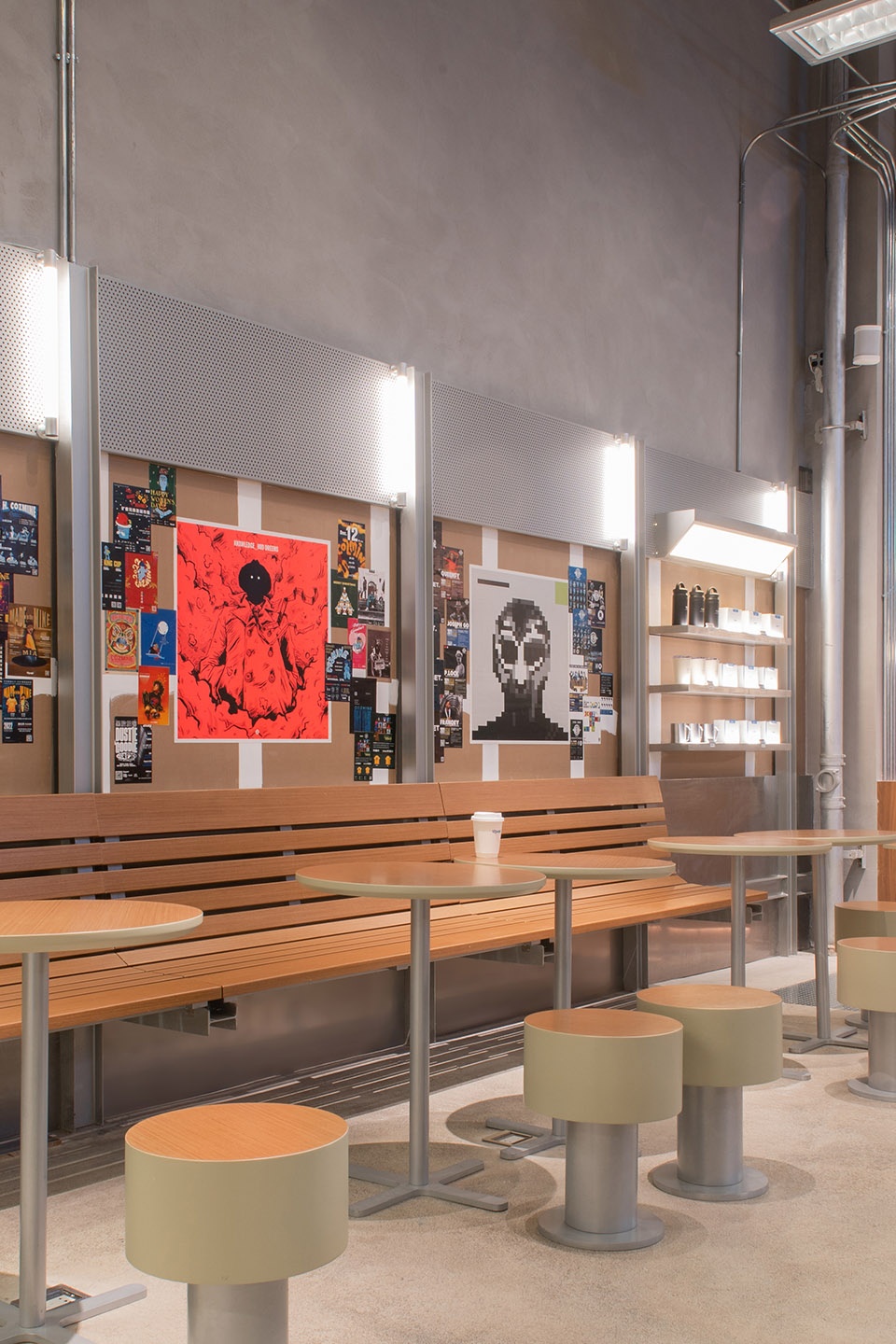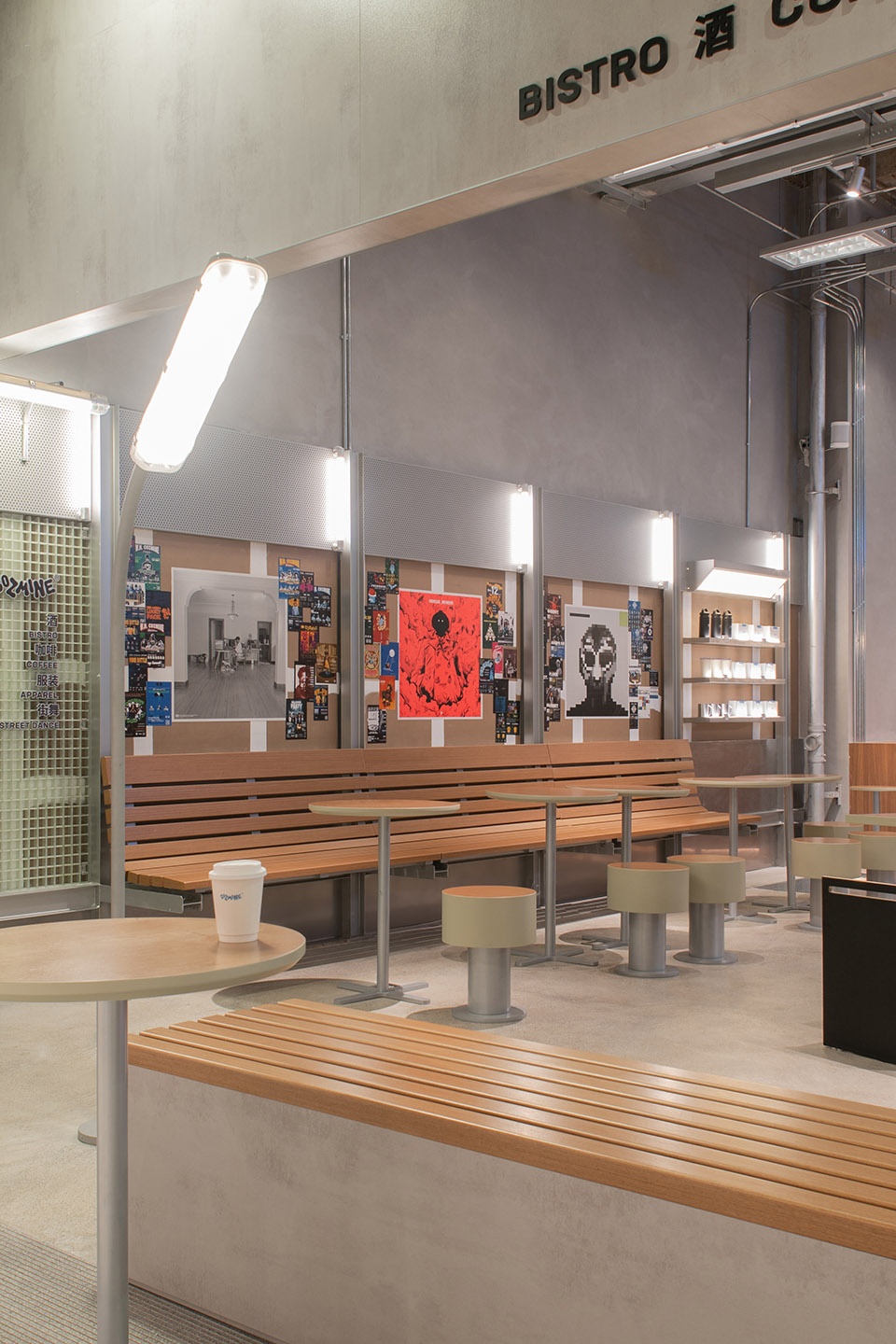 有趣的点在于,铁轨将店面分隔成为两部分。随着车厢移动不同的位置,空间的功能随之产生不同的变化,以适应多时段的经营需求。白天店面呈完全开放状态,轨道的两侧为咖啡与服装售卖区;而夜晚店面经过车厢的移动,空间变换为半封闭状态,酒吧与街舞主题活动空间应运而生,打破传统零售店单一功能性的印象。