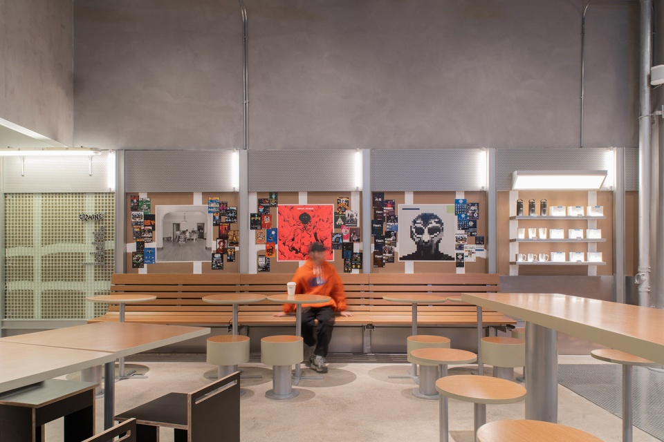 街头与自由是COZMINE的价值主张,入口处设有临时就座区域,有意模糊店铺与公共区域的边界,意图吸引更多人驻足、参与、连结、一同创造。“矿运站台”给过往乘客们提供轻松休闲的场所,大家随时可以加入,站台永远开放给路过的行人及乘客们。相较于1.0空间,外物 WHY WOULD 希望持续表达品牌的精神内核主张,构建一个适用于多种功能并令人印象深刻的独特空间。
