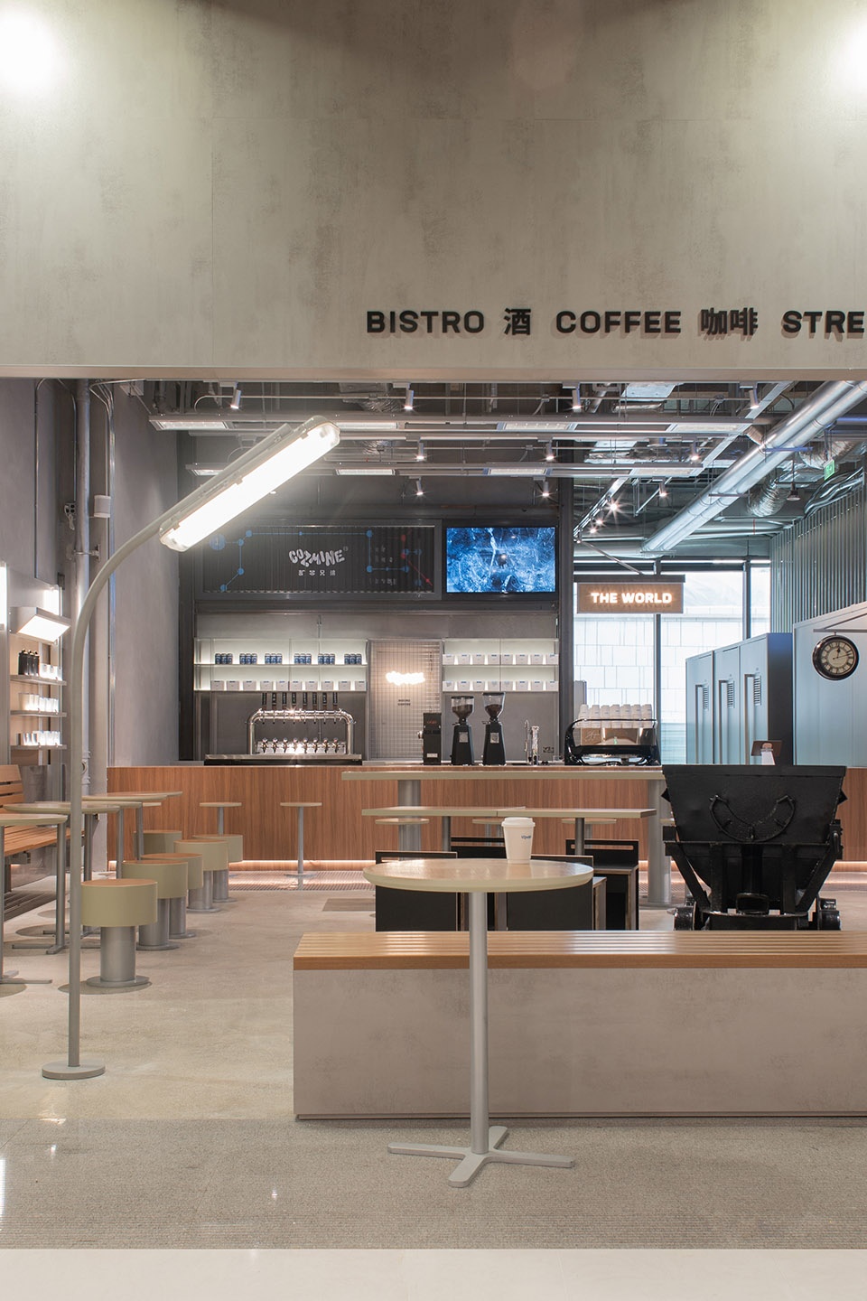 在站台中,装载矿产资源的货运列车经过抽象化的表达被置于空间中,通过地面的铁轨将店面分隔成为两个部分。车厢既有划分空间功能的作用,同时也承载着各自的功能。