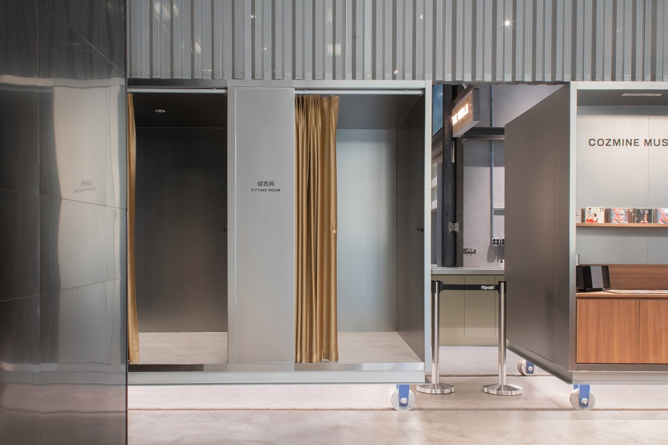 Based on the diversity of space status switch, WHY WOULD makes an overall display system design for the space. No matter it’s the costume shelves or display props, they are all equipped with flexible and mobile roller structure, which satisfy the requirements of scenario and available to extend more functions.According to different use scenarios, the prop can change to different functions, such as costume exhibition/dance stand/DJ playing table.