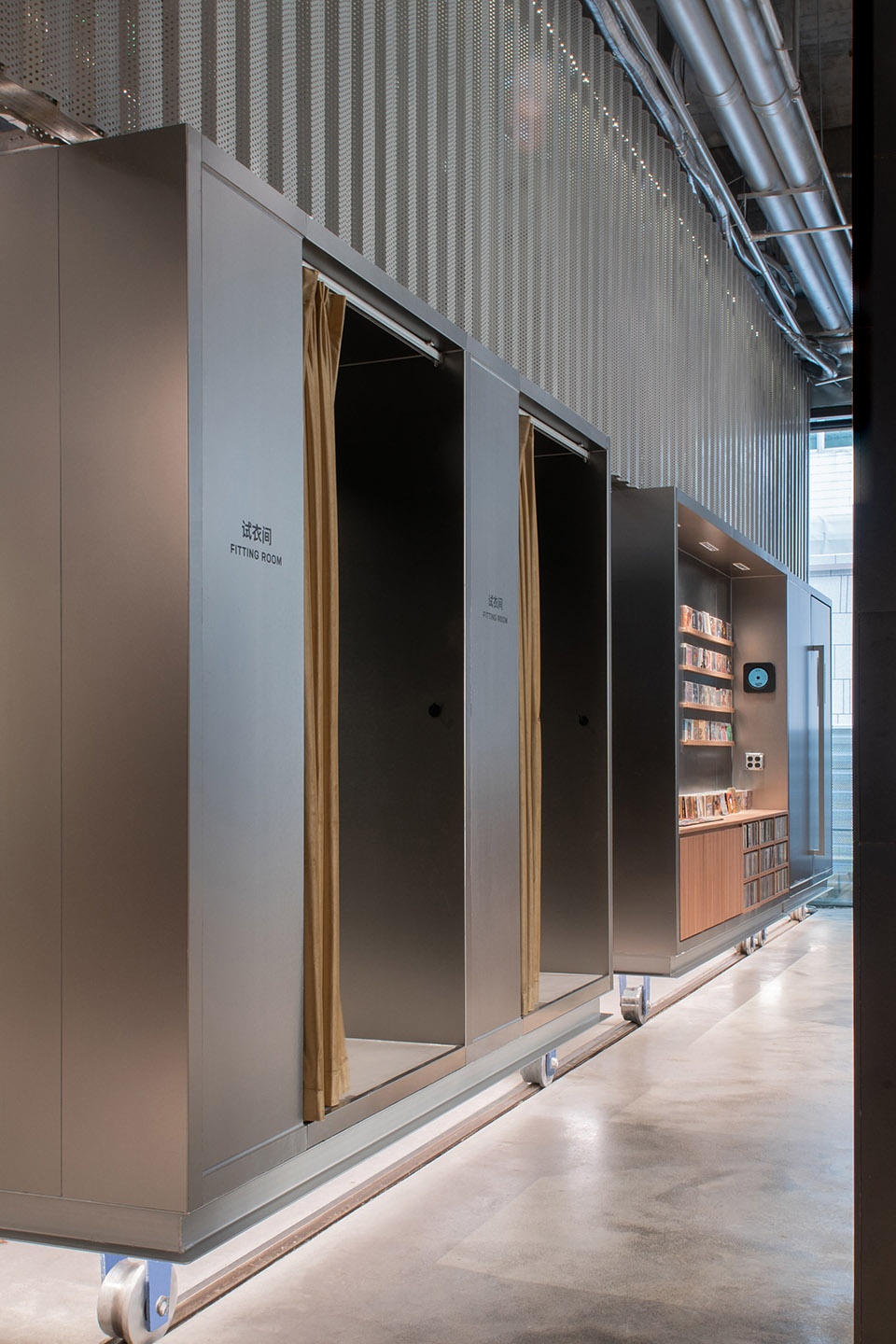 站台由铁轨/四组车厢/等候座椅等构成,四组车厢经过不同的功能划分,分别集成服装展示/酒水展示售卖/黑胶体验展示/更衣间/CD体验展示/储物间/清洁间等众多功能。