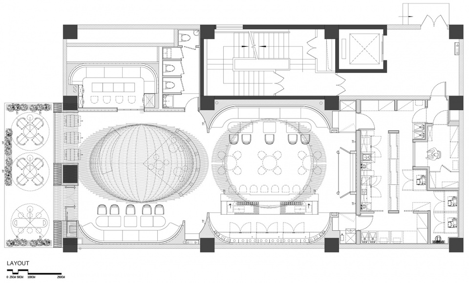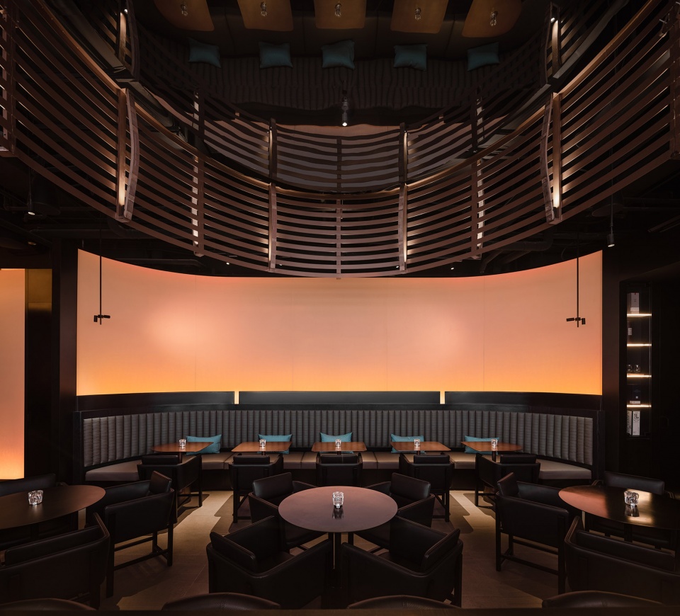 We use non-woven fabrics to imitate the texture pattern of oak to form the background wall of the wine display in the space and the upper half of the wall in the booth area. The changing color and slightly shining lighting atmosphere neutralize the sense of stability and coordination of the dome wood structure on the top surface, making the overall space atmosphere younger. The smoked metal plate and distilled copper plate materials form the other wall parts, which reshape the sense of thickness and the dark characteristics of the whiskey bar.