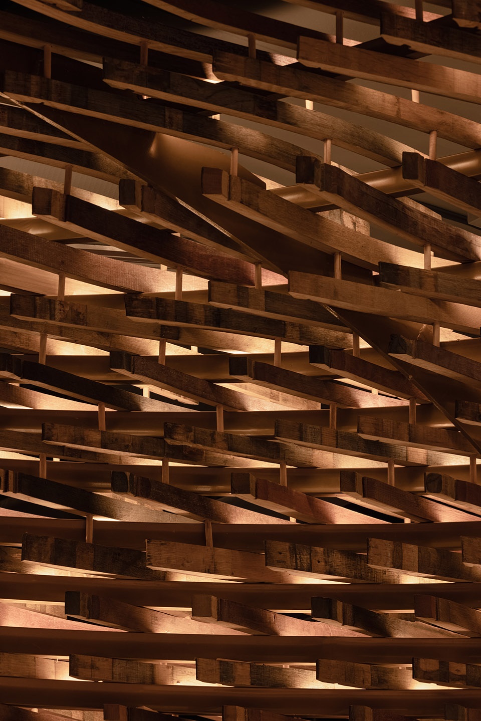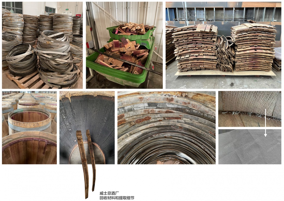 We used around 6,000 pieces of discarded wooden barrels dismantled from the whiskey barrels of the distillery to assemble the long site from the outside to the indoor entrance tasting area until the bar area in the back area to form a coherent flow spatial visual experience.