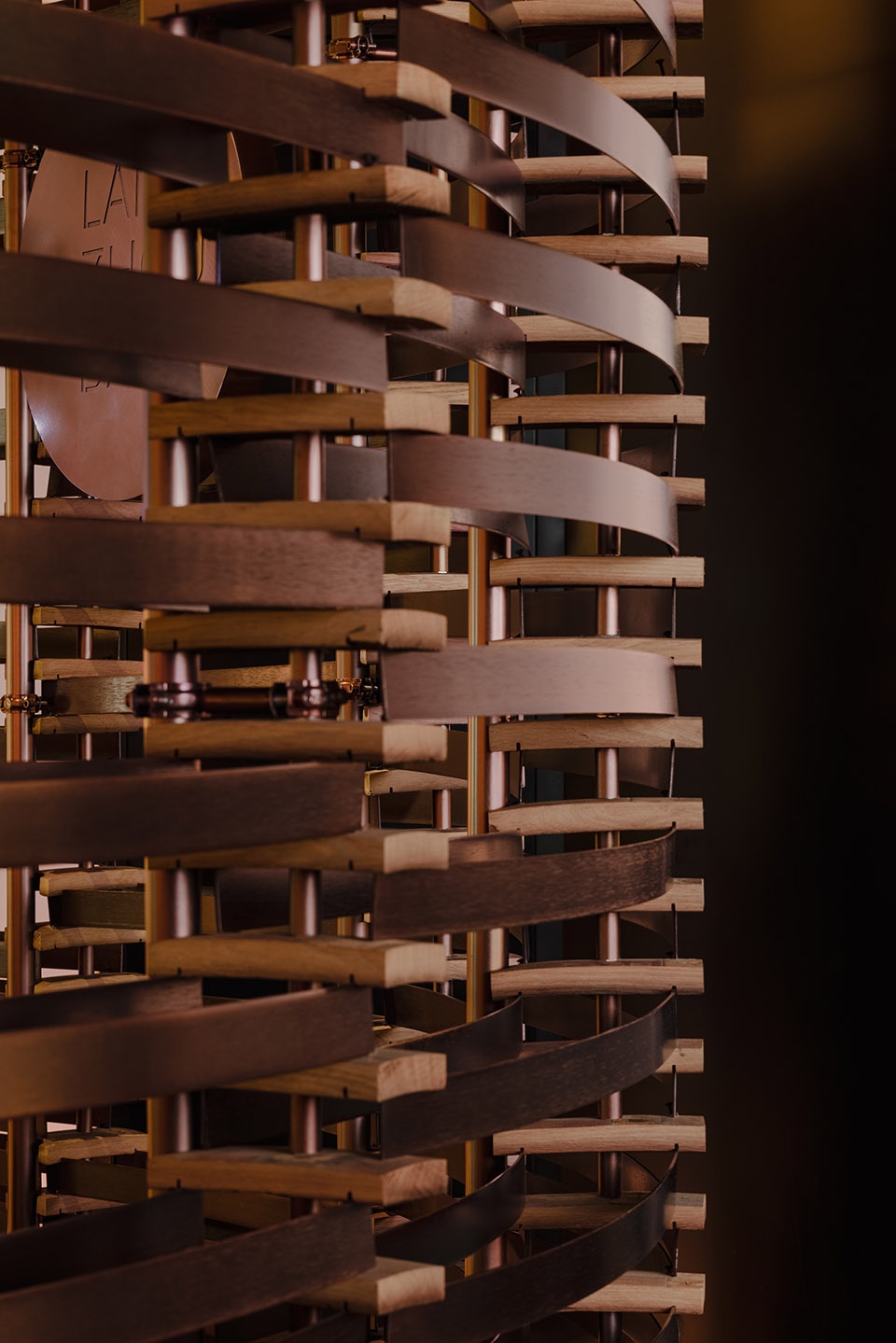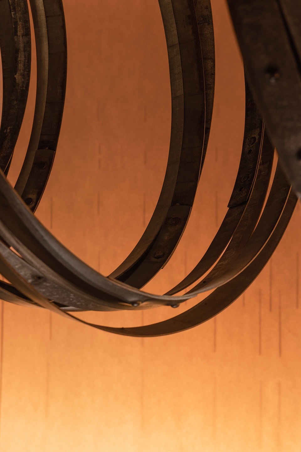 在流动的造型基础上,通过木结构独特的使用痕迹,带给了空间特有的时间循环和岁月冲刷的历史感。另外,在品鉴区和酒吧区的分区隔断上我们把废弃的金属环以及裁切的一部分带孔的木片结构组合起来,形成上下连贯的材质表达。并且运用部分废弃桶金属环制作了VIP室中的灯具装置,金属环本色透过环境灯光的辅助,自然表现出一份特殊的艺术面貌。