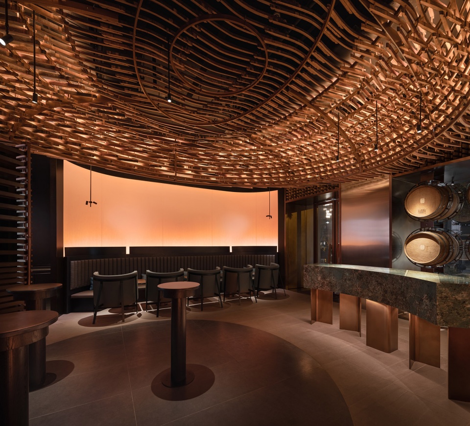 Based on the flowing shape, the unique use of traces of the wooden structure brings a unique sense of history washed by time and years to the space. In addition, in the partition between the tasting area and the bar, we combined discarded metal rings and a part of the cut wood structure with holes to form a coherent material expression from top to bottom. At the same time, the VIP room lighting is made of metal rings of discarded barrels. The natural color of the metal ring is assisted by ambient light, which naturally shows a special artistic appearance.