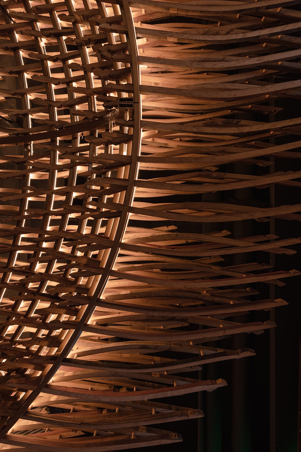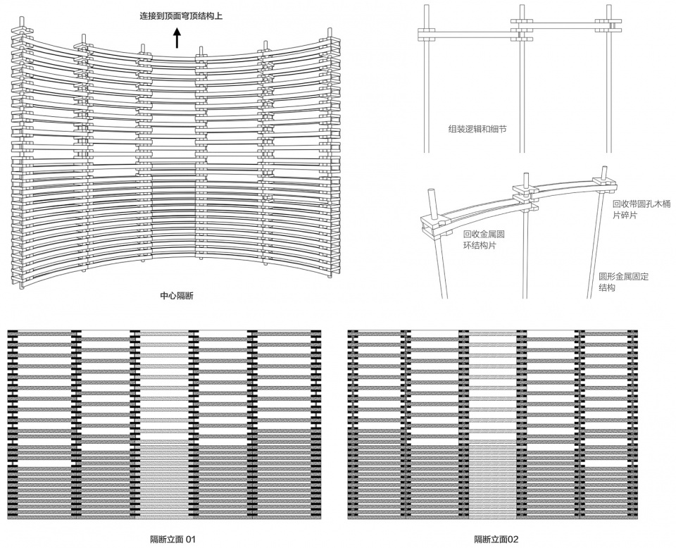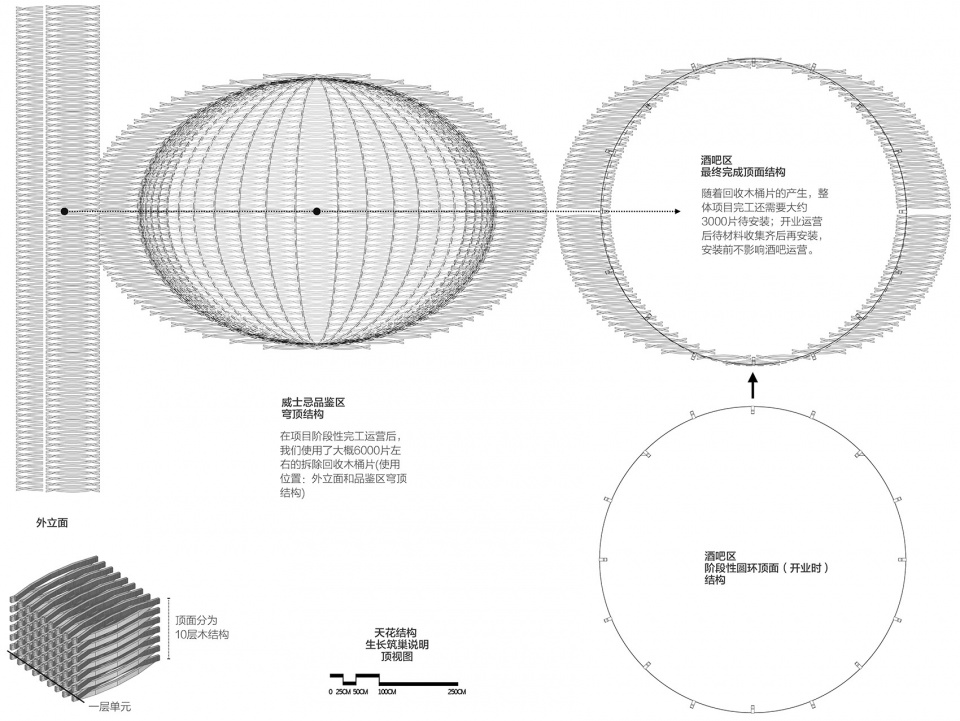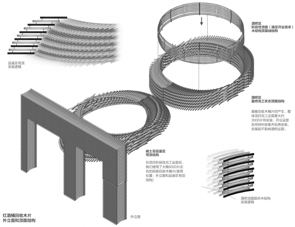 每一片被拆掉的木桶片在木片弯曲弧度、宽度、长度和纹路上均不同。通过每片不同的尺寸细节和纹路,我们把其进行分类应用到外立面和穹顶不同的位置中。我们很清楚的知道,废弃的橡木桶数量是有限制的,在这个前提之下,评估整体酒吧的形象设计,针对双环结构的双穹顶,我们决定如同筑巢般,先筑出品鉴区的穹顶,而后伴随着时间的增长而产生的废弃木桶片,再一步步积累朝向酒吧区的穹顶做构筑。而酒吧区的顶面金属结构为下一步木结构的增加做好了现场的结构基础。