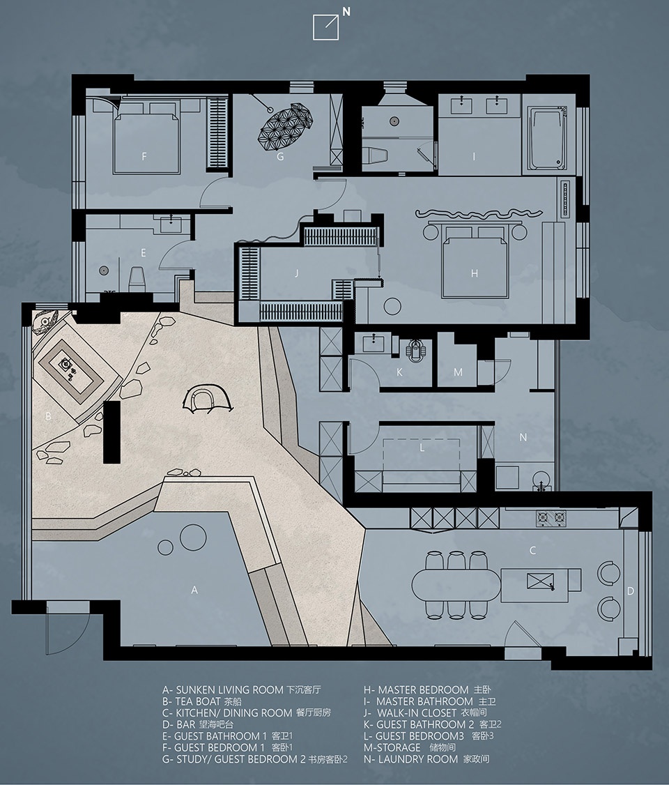 布局上,整个家以抬高客厅作为家的公共活动中心“岛屿”(观影区、阅读区和品茶区),利用地台高差实现下沉式客厅。围绕“岛屿”是开放式厨房餐厅与私密的卧室空间。整个平面布局与大海无缝交织,室内与室外形成精致的结合。