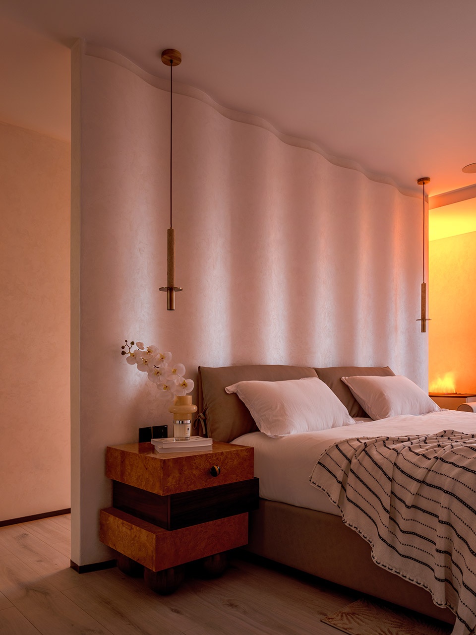 岛是家人聚集的互动领域,海是回归自己的休憩之所。海浪造型墙,洞石吊灯,树瘤皮柜子和篝火,仿佛置身海边。主卧墙面采用自带光影变化的“丝绒”艺术漆,为床头背景墙增添柔软的质感。床头波浪造型墙分隔睡眠空间与卫浴空间,既增加了空间的通透性,又保留了卧室的私密感。