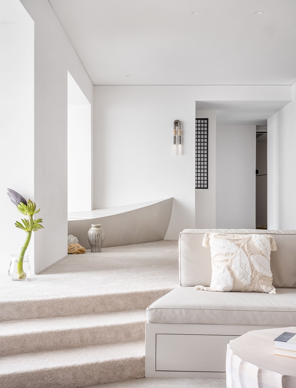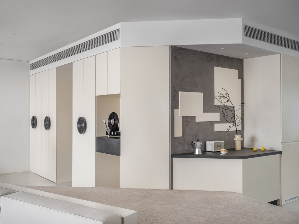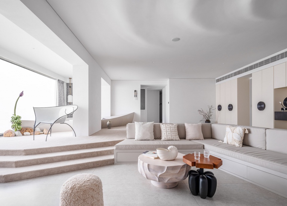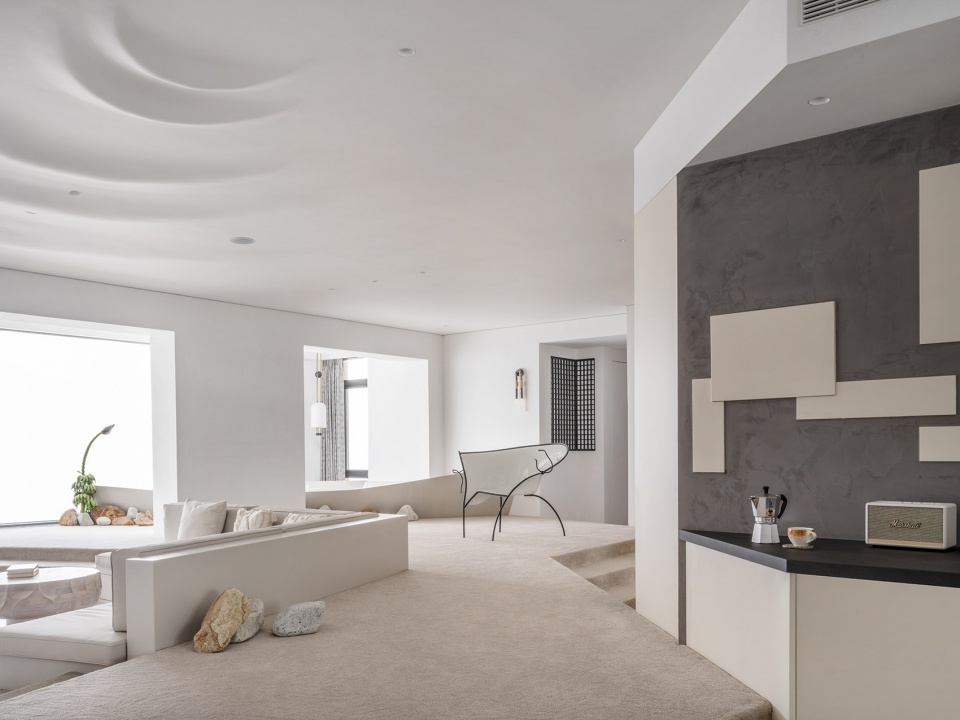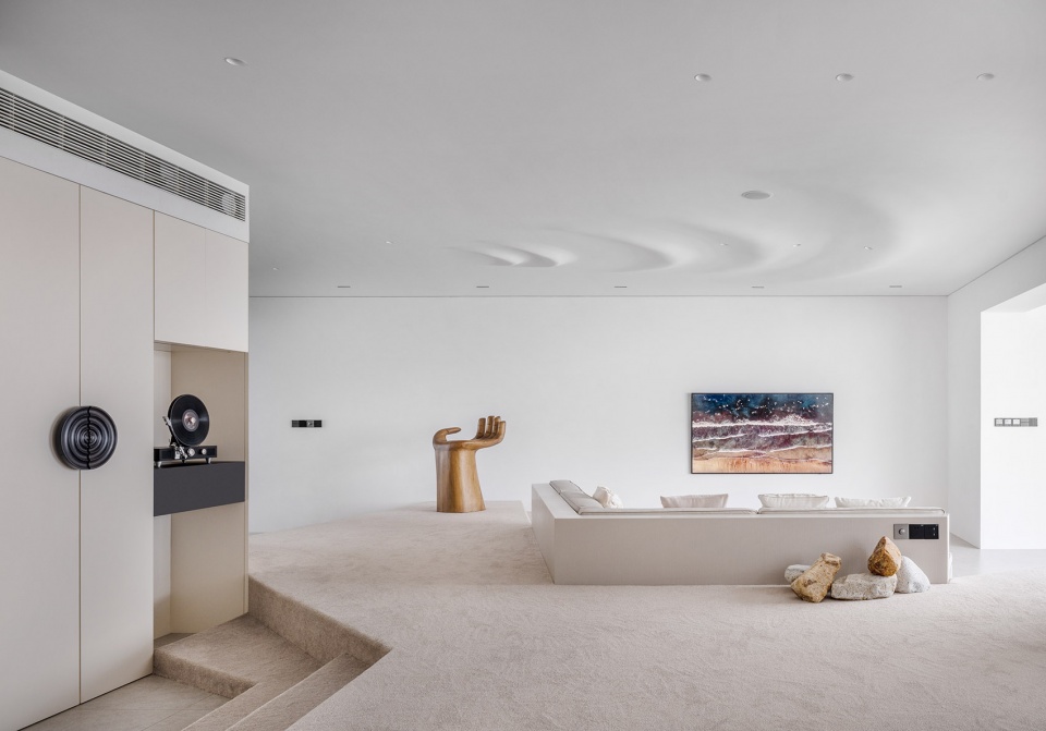 设计过程中尝试让材料发挥它们的温度属性以此来描写空间的精神隐喻:瓷砖温度如同大海般沁凉,松软的地毯像是被太阳烤过的沙滩。赤脚去感受“海水”与“沙子”两种反差质感带来的心灵抚慰, 在“沙滩”上留下生活的足迹。墙面采用定制砂岩艺术漆,阳光下白色沙石墙面闪耀出矿石晶体,仿佛像外墙材料一样,让人产生一种在户外的错觉。整个项目通过从自然环境到室内空间和家具的思考,传达出设计对生活方式的塑造力,以及突破传统住宅模式的创造力。