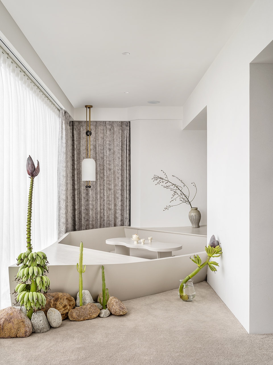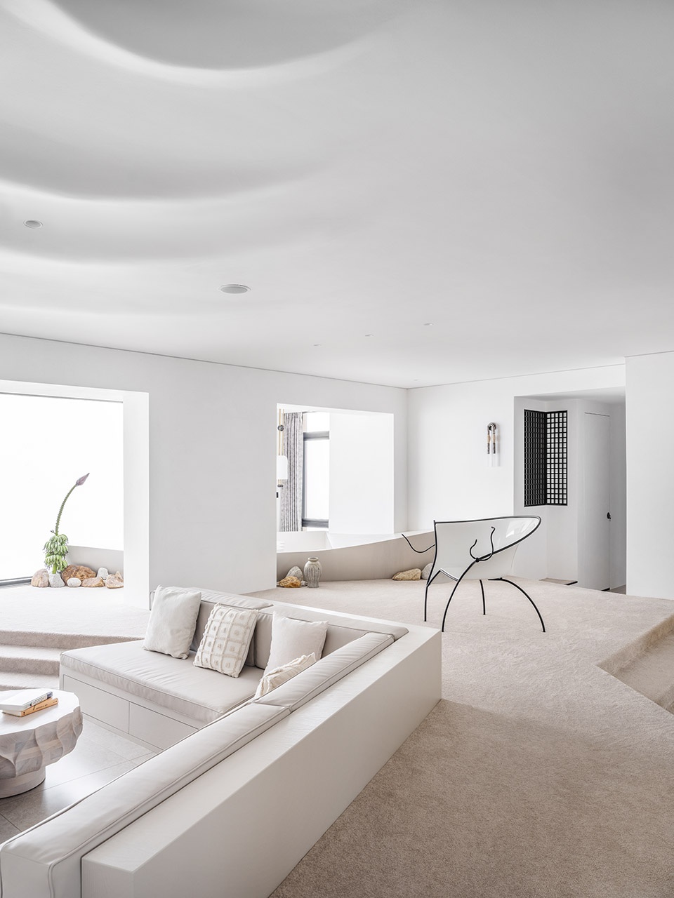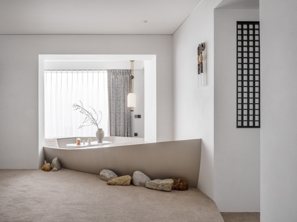 A tender sea breeze whispers from west to east, casting ripples across the ceiling. Within this minimalist space, the ceiling appears to have been gently “lifted”, its light and shadow dancing in harmony with the day’s progression. The wall-mounted TV seamlessly melds with the pristine wall, maintaining the room’s enchanting elegance while inviting leisurely indulgence. Resting on the “shoreline”, a charming wooden boat invites you to sit, savor tea, and lose yourself in the vastness of the sea. Traditional tea room conventions are reimagined, using furniture shapes to evoke a laid-back, beach-side atmosphere. Lovingly handpicked by the homeowner from the shoreline, each stone beside the tea boat possesses its unique story.
