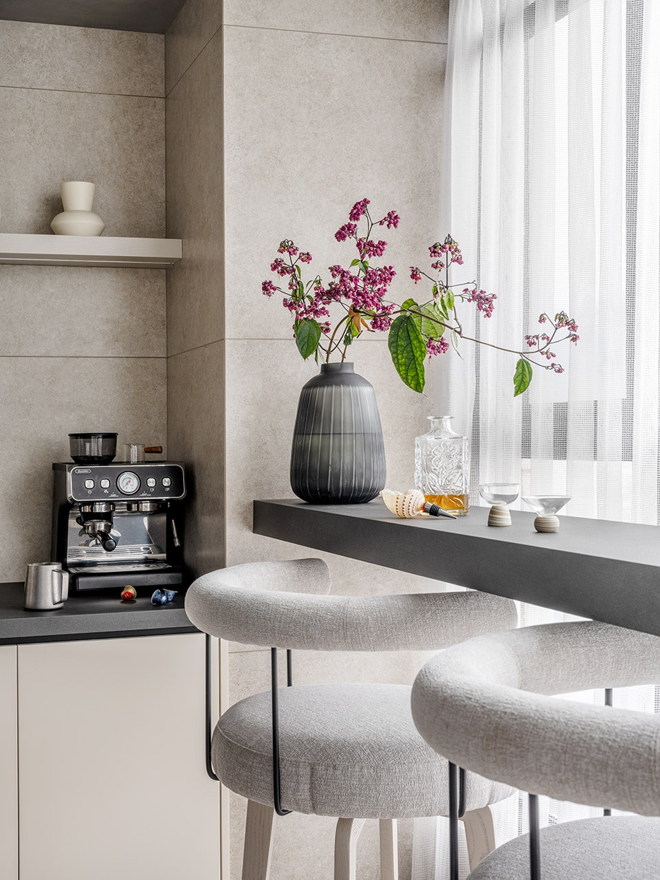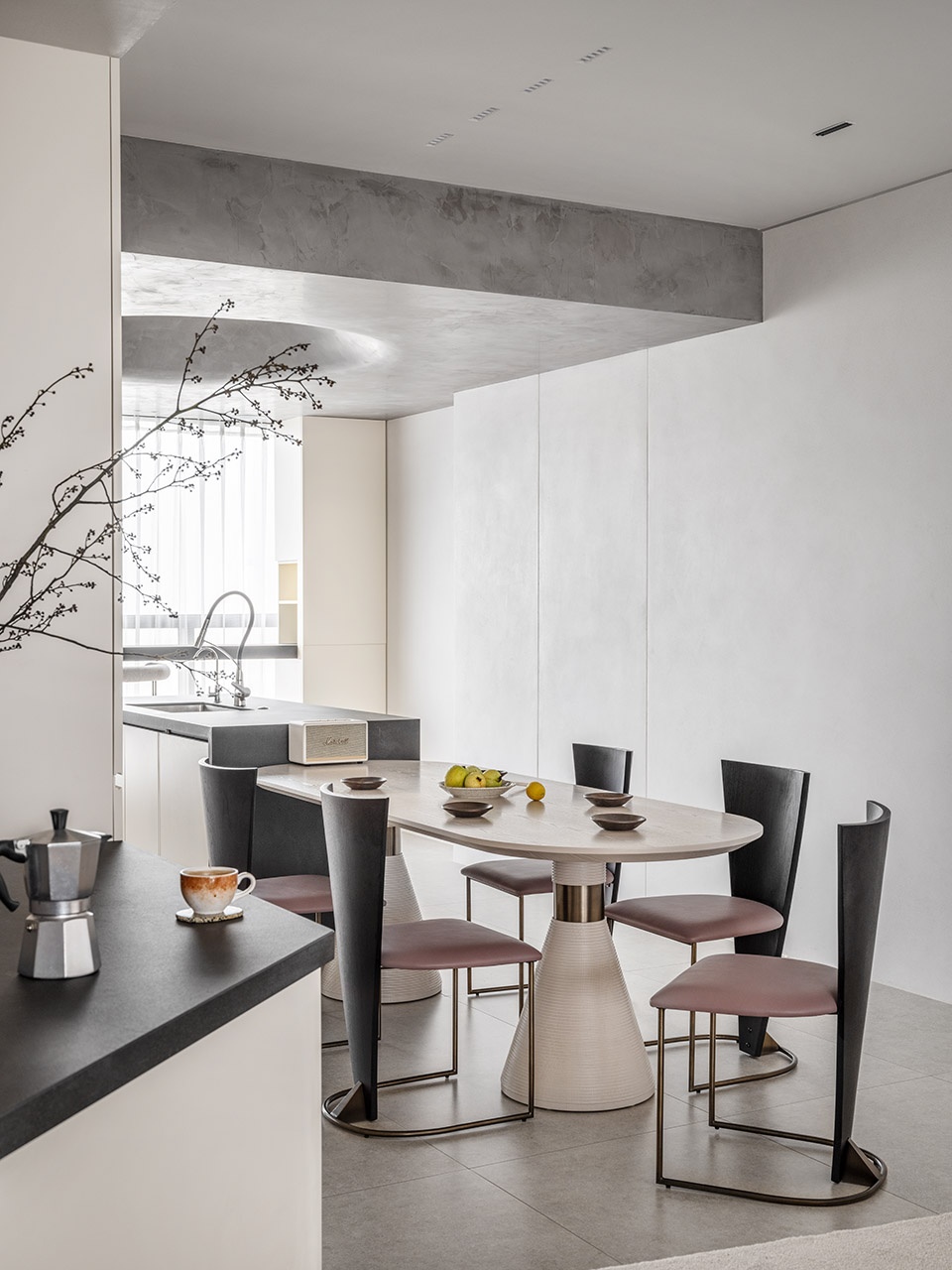 Enveloped in gray rock slab countertops, white wax wood, and carbonized wood, the dining area exudes a leisure seaside ambiance. The furniture’s aged metal fittings bear the marks of time, as if eroded by the relentless caress of the sea.