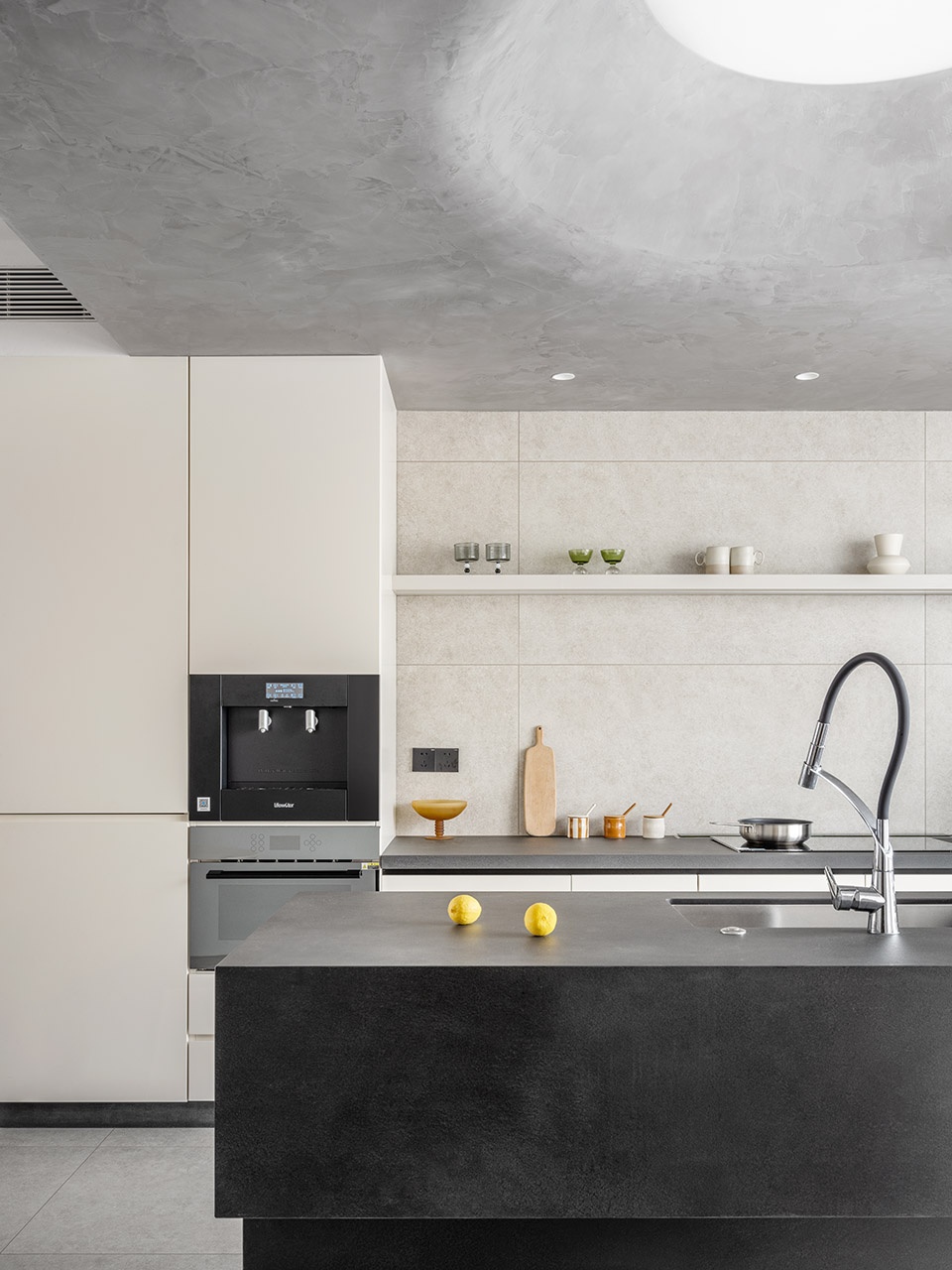 厨房的天花用艺术漆模拟太阳光拨开层层云朵的天光氛围。设计上最大程度减少外露电器,选用隐藏式冰箱和洗碗机,内嵌升降油烟机,满足日常生活需求同时将美观最大化。厨房的悬空观海吧台,连接人与自然,人们可以在这里和自然进行互动。