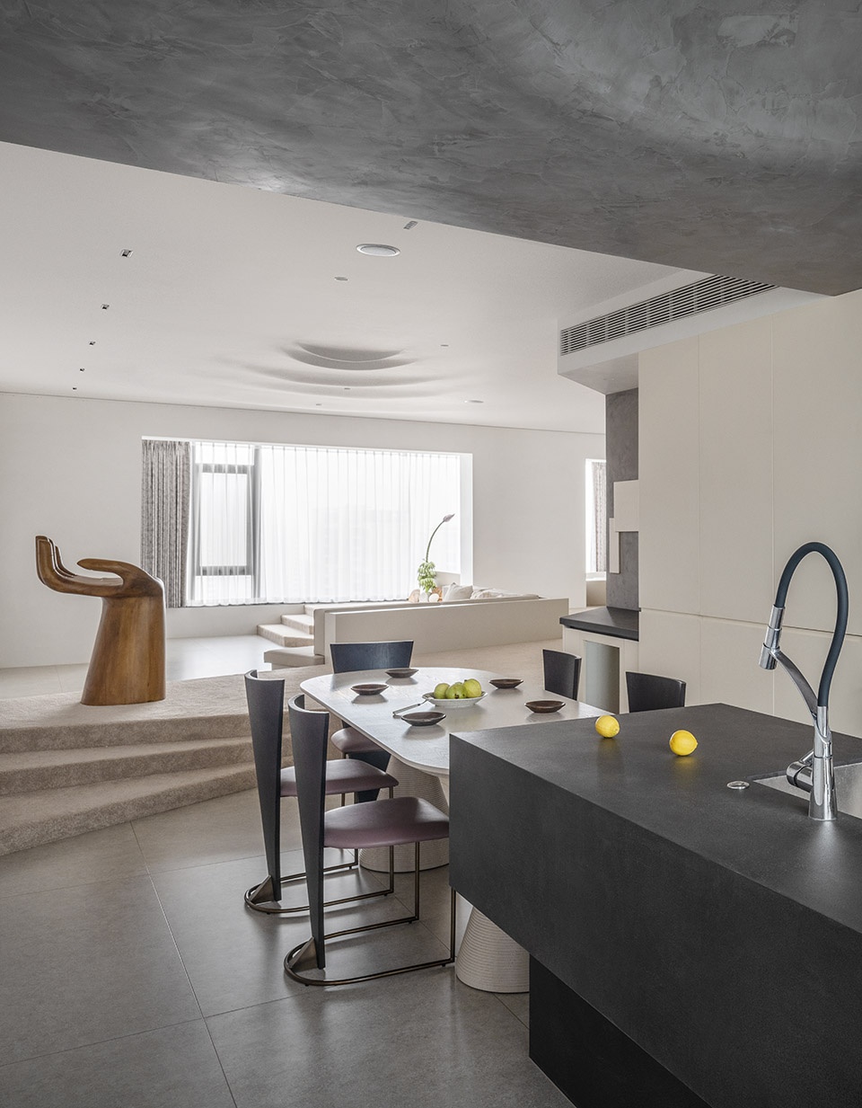 等比例大小的茶船是入户初登海岛的第一印象,船的曲线轮廓和倾斜摆放打破原始建筑结构的对称性,使硬朗的洞口线条松弛下来。抬高的地台让茶船底部有更多空间,使茶桌符合人体正常使用的舒适高度。下沉式客厅使空间层次丰富,异形地台与沙发构成一个整体。木质小边桌的选择呼应了海边主题;柜门拉手灵感来源于树的年轮,是设计师为该项目设计,增添优雅的自然之美。