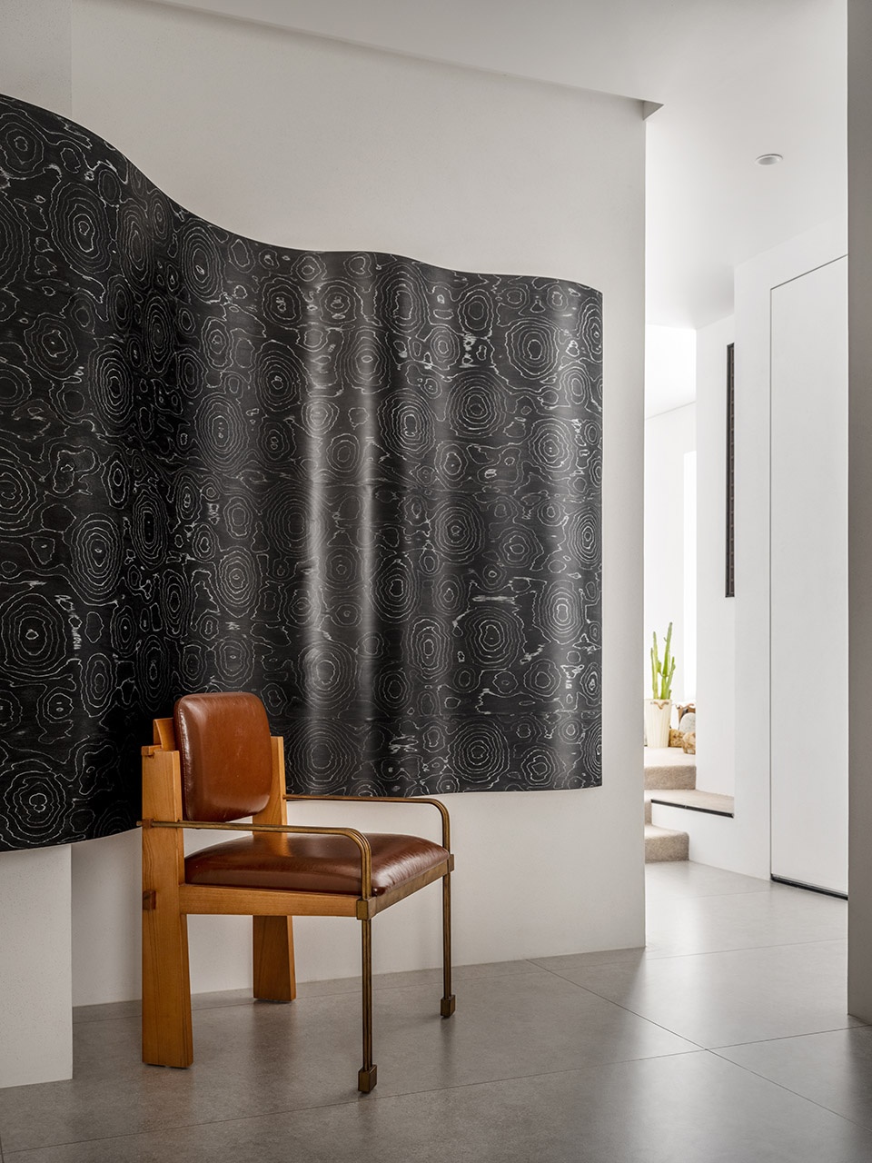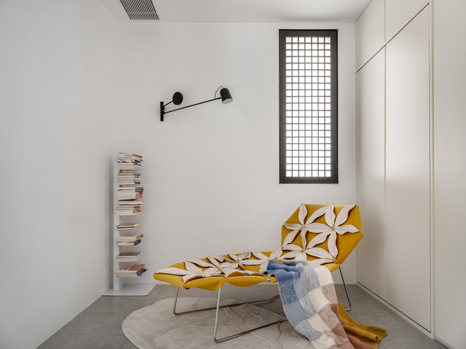 穿过会客区的走廊是一个多功能的小空间,好像一个沙滩上的休息平台。这里平时作为开放阅读区域,打开下翻床和联动推拉门变成一个供访客休息的独立卧室。小空间里实现多功能大意境。层层递进的动线也是这个房子想要传递的乐趣。曲面墙体搭配印花木皮,让人联想到摇曳的海草。海风拂过天花,也抚过这片“海草”,一把旧椅子安静等待着诉说故事的人,有动有静,让过度空间多了一份神秘感。