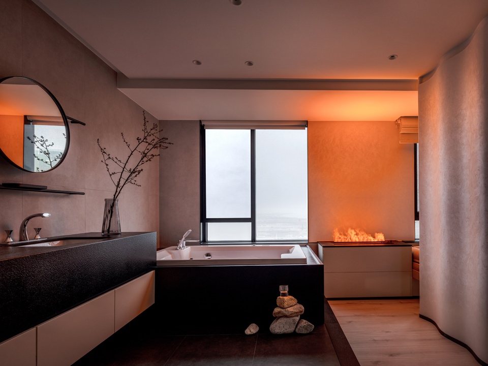 浴缸在靠窗处,构成全海景视角。泡澡时侧头便能看到窗外的海滨夜景。点燃壁炉,放松身心。开放式卫生间采用四分离式设计,使主卧空间视觉扩大。