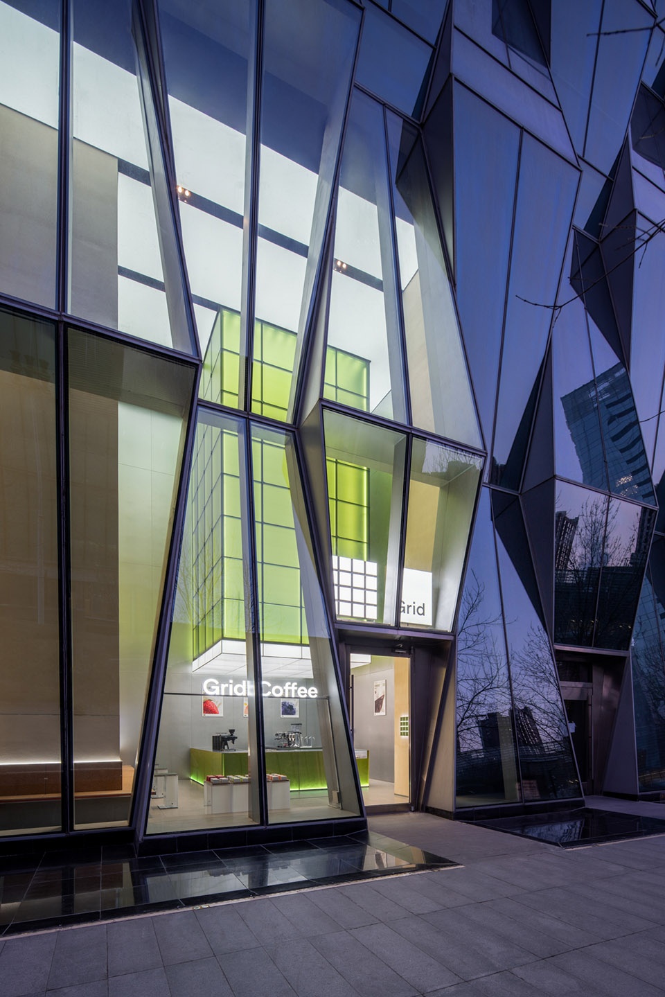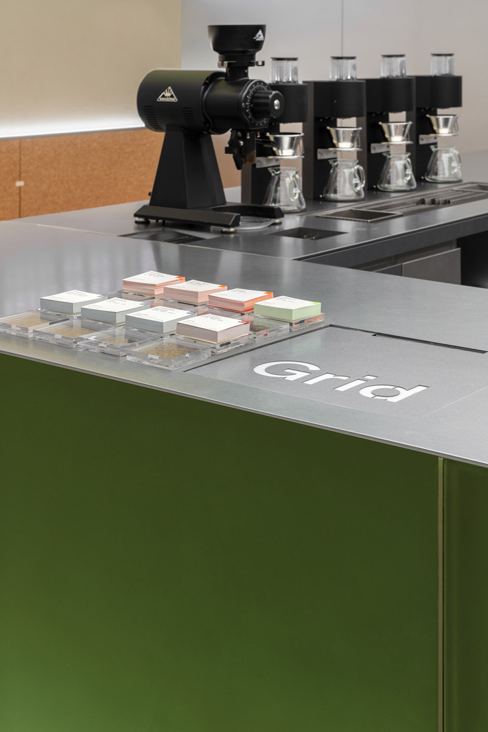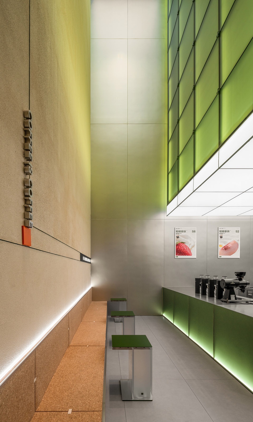 In August 2022, Grid Coffee opened “The Black Spot”, a black flash coffee truck in Beijing’s Sanlitun Taikoo Li. In the first 48 hours, they sold 1,068 cups of black coffee. As Grid Coffee’s daily form, the Grid Coffee China Jin store in Wangjing returns to the brand’s green color (PANTONE 5753 C), and the grid is an important element of the overall design.