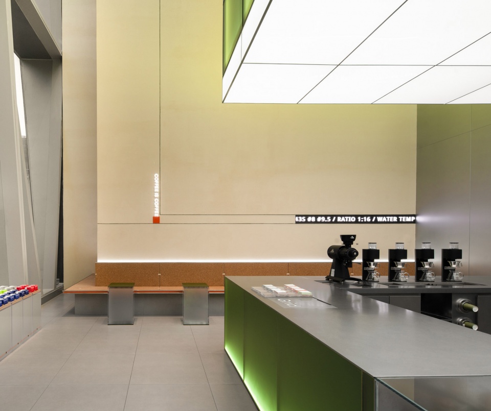 正如Gird的品牌关键词“纯粹”“专业”和“快速”,空间基于理性而精确的考量,Das Lab将空间的重点和中心全部放置在核心的操作吧台的区域,我们结合咖啡师的工作习惯和设备的硬性条件,对吧台进行推敲,以此来打造出一个极具专业且高效的专业吧台,并结合天花的格子灯箱,形成品牌视觉嵌入消费者的记忆点。