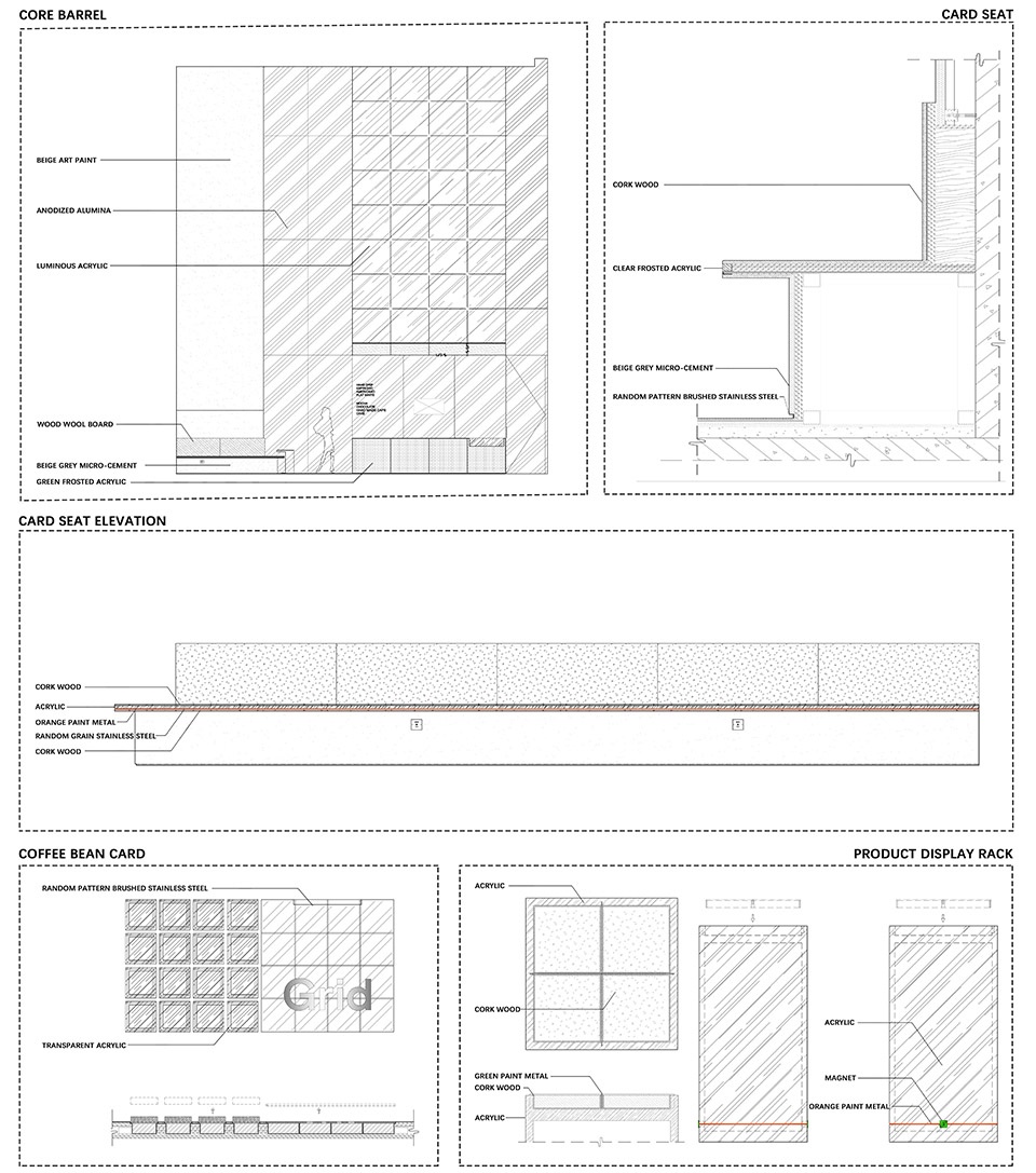 我们经过和Grid Coffee团队的不断摸索,从品牌的态度和理念出发,围绕着品牌的LOGO展开空间的叙事。以300×300作为空间的基准尺度进行延展,界定了空间、吧台和道具的尺度,是空间的秩序,也是Grid Coffee对咖啡的严谨态度。