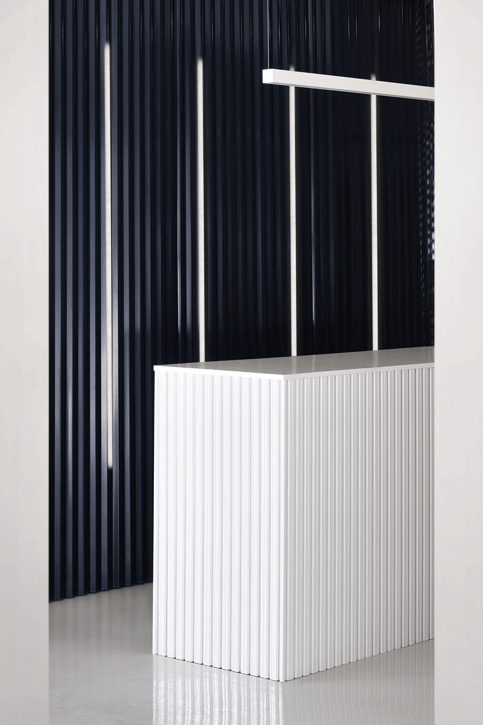 In several areas, neon lights are hidden behind the perforated steel sheets, creating unique visuals and putting a spotlight on some feature elements of the project. At the entrance, for example, they are displayed behind the central counter made of white extrusions manufactured specifically for the occasion. In the kitchen, a structure lit up from the inside hangs above the island and acts as a division between the functional and the gathering areas.