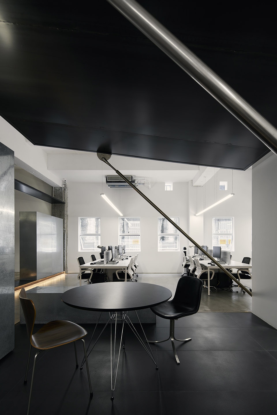 天花板呈倒三角形,桥梁拉索为支撑形成桥体。在原始本色为基调的空间内,家具延续延续外立面的黑色,营造出包容万象的神秘与实验感。