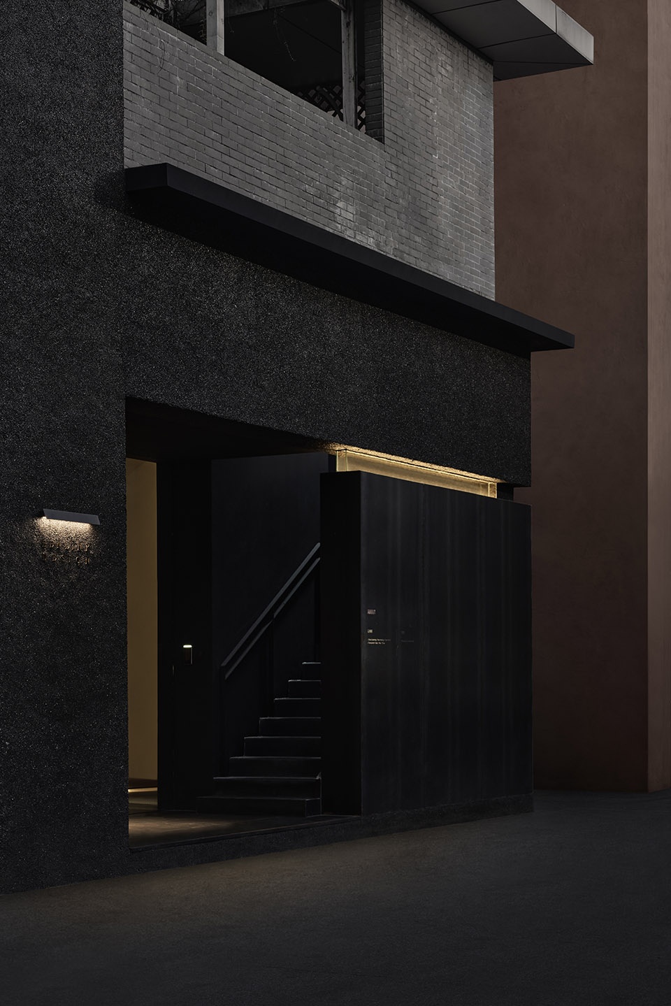 外立面采用黑色胶粘石,整面黑色中设置长条开口,破除大面积黑色带来的肃穆感,作为内外流通的气口。并将照明设备藏于开口内,满足夜间照明需求。门面上没有张扬的招牌,简介与生铁板融为一体,字迹随着时间自然斑驳。一旁设有玻璃落地窗,由此内外形成互动,立于街道便能看见内部前厅,指引来者进入。