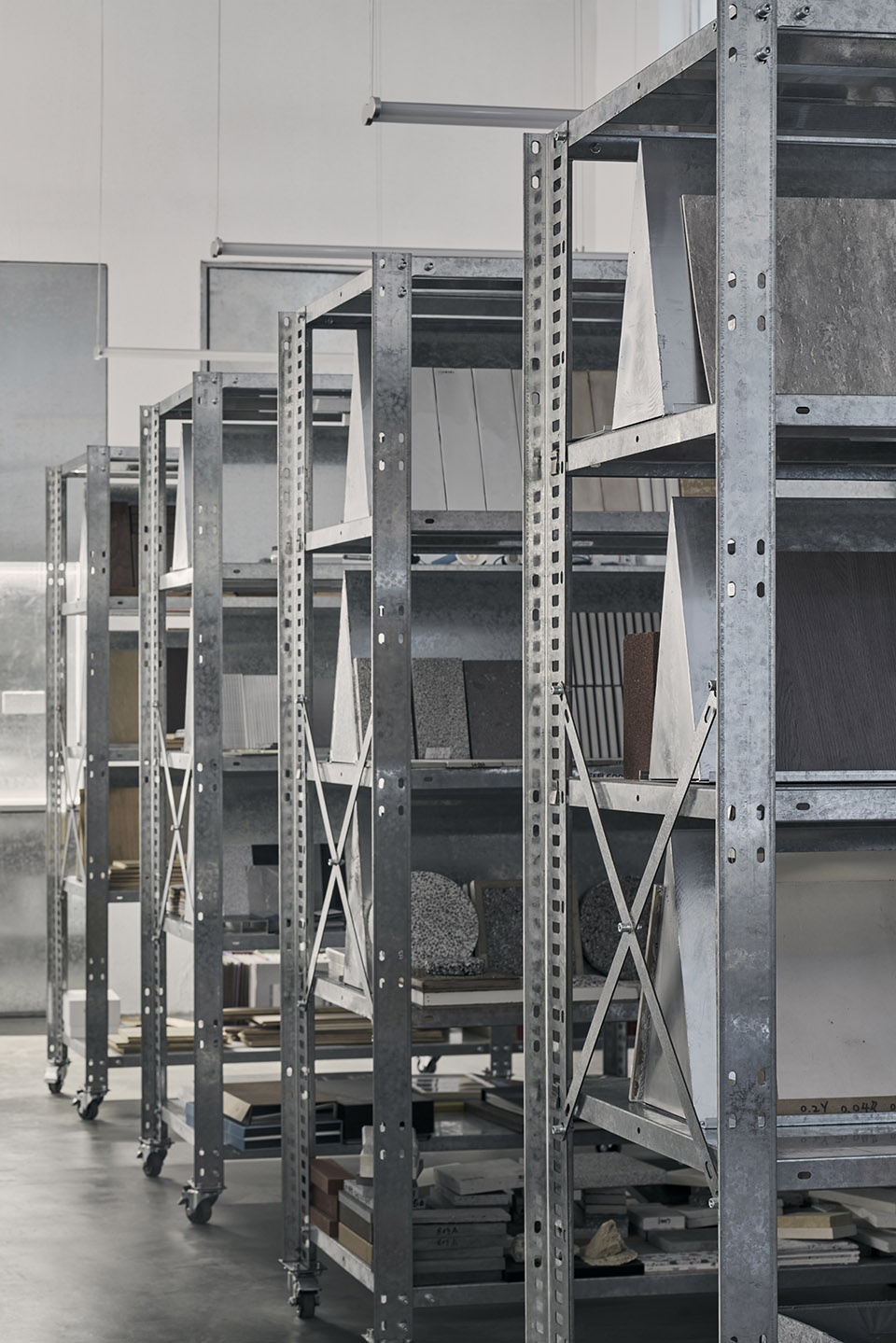 工作区域的桥体则以岛的形态,串联办公大厅和材料手工区。中岛作为空间中心主体,承载日常讨论互动。岛两端经由镀锌板展柜体块围合,自然划分区域并形成回游动线。抽象处理的展柜体块呼应桥体上的货柜,并与整体环境达成和谐的状态。