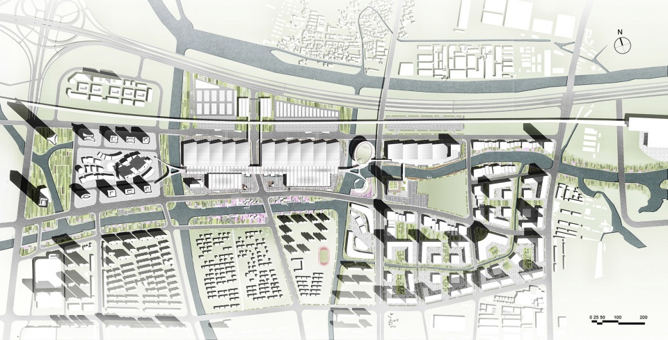 The site lies in a largely east-west direction, with an east-west length of about 900 meters and a north-south width of about 250 meters. Divided into A, B, and C three blocks from west to east, the project will be developed and constructed in two phases, phase I including blocks A and B, and phase II involving the construction of block C. Both phases and the Chinatex CBD area are separated from each other by existing municipal roads, and thus the key to integrating and organizing the urban resources around the site is to establish a continuous east-west urban space and functionality.