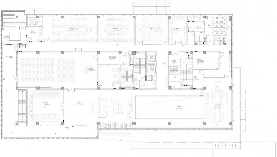 项目的使用功能丰富,空间结构复杂。其中比较困难的是首层多功能厅的结构设计。业主要求可同时容纳300人参与会议的无柱大厅,而它的设置在首层,是结构的重要部位。要实现无柱大空间就需要抽去4根柱子,普通的梁抬柱转换方式会导致抬梁很高,占用过多竖向空间,再考虑吸音吊顶厚度,则多功能厅层高就会显得压抑,不但导致室内效果不佳,同时抬梁的配筋量大,比较费钱。在“限价设计”的要求下,我们要选择既节约费用,又能达到空间效果美观的结构方案。经过与总工的多次沟通,我们大胆地采用了斜柱方案,将首层被抽掉的4根柱子,做成斜柱,调整好倾斜的角度,竖向跨越2层,有效地解决了首层的大空间问题,且不影响其他层的使用。
