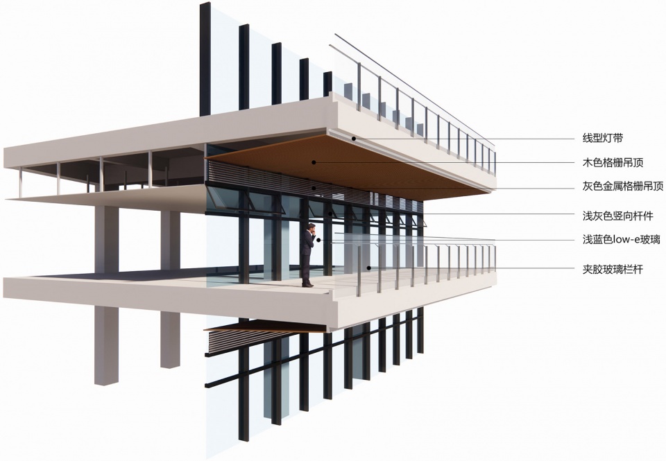 结合造型所需要的折板形成层间的遮蔽主体,再配合窗上横向百叶,和局部竖向木格栅,构成了建筑物主要的立面。玻璃幕墙及其杆件选择了颜色很浅的高级灰,有效避免了热量的吸收。西向是主要的景观面,也是西晒的重灾区。所以,向西的每一层都设计了出挑很大、各层宽窄不同的露台,一方面为欣赏落日提供了最佳的位置,另一方面形成的深远阴影为西侧的外窗提供了有效的遮蔽。