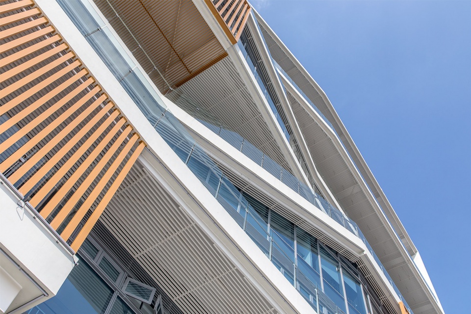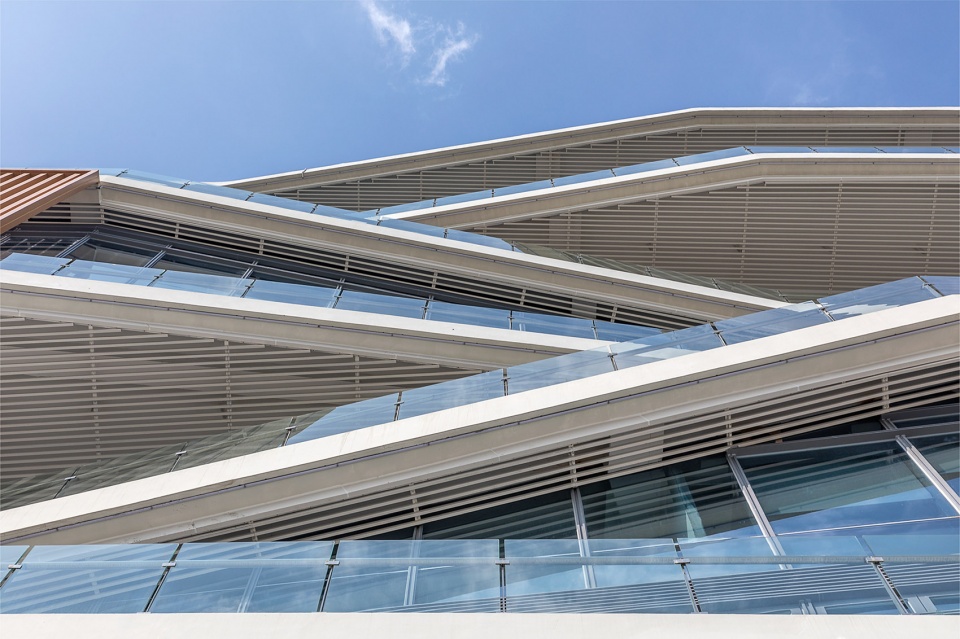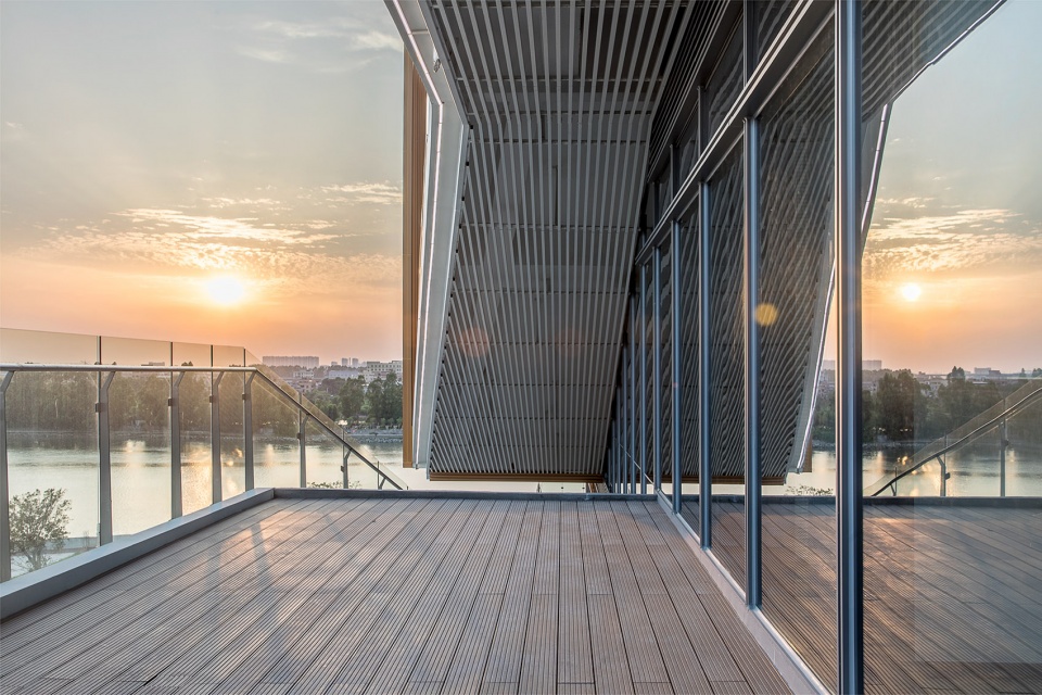 Combined with the folding panels required for the modeling to form the main body of shading between floors, the horizontal louvers on the windows, and the local vertical wooden grilles, the main façade of the building is formed. The glass curtain wall and its poles are chosen in a very light color of high-grade gray, effectively avoiding heat absorption. The west-facing facade is the main view surface and the hardest hit by the west sun. Therefore, each west-facing floor is designed with a large protruding balcony with different widths on each floor, which provides the best location to enjoy the sunset on the one hand, and the deep shadows formed on the other hand provide effective shading for the exterior windows on the west side.