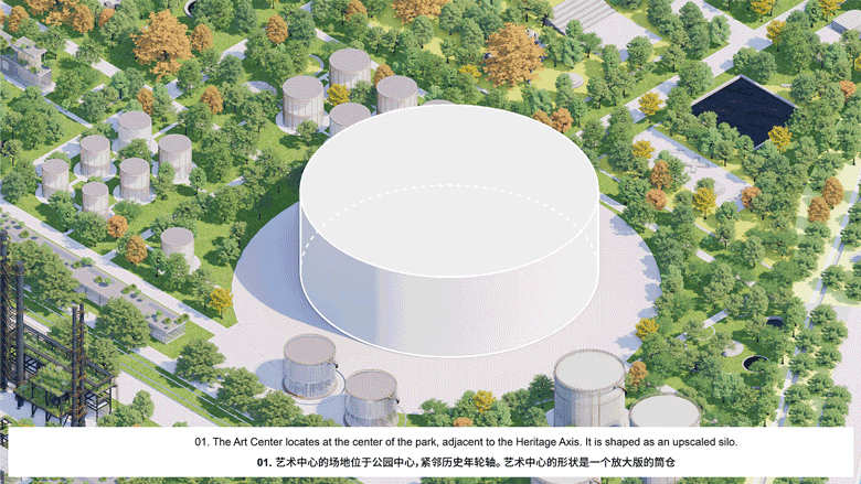 整片区域内的核心建筑是一座「艺术科技中心」,圆柱形的外观呼应并放大了曾经遍布厂区的油罐结构。简单的建筑立面内隐藏着高度复杂的内部结构:圆形的展览大厅位于负一层,两层通高的空间为布展提供了更大的可能性;地上部分设置了一系列不规则堆叠的矩形盒子,其中设有艺术家工作室、办公室和配套商业。盒子顶部形成了一系列由楼梯和桥梁连接的露台,激活了「艺术科技中心」场馆内的公共区域,同时可用于展出大型装置、举办演出和各类活动。