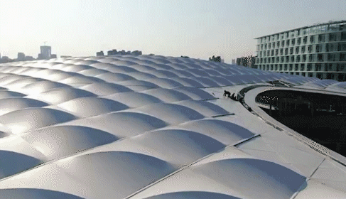 The huge ceiling above the venue is the key and difficult point of this design. We use a bidirectional truss system with a maximum cantilever of 16 meters, supported by slender steel columns. The top surface is covered with PTFE film coated with titanium dioxide, covering a total area of 21,000 square meters. Each unit rises slightly in the middle, looking from a distance like the ripples created by the breeze blowing across the water, a metaphor for the regional characteristics of Shaoxing water town.