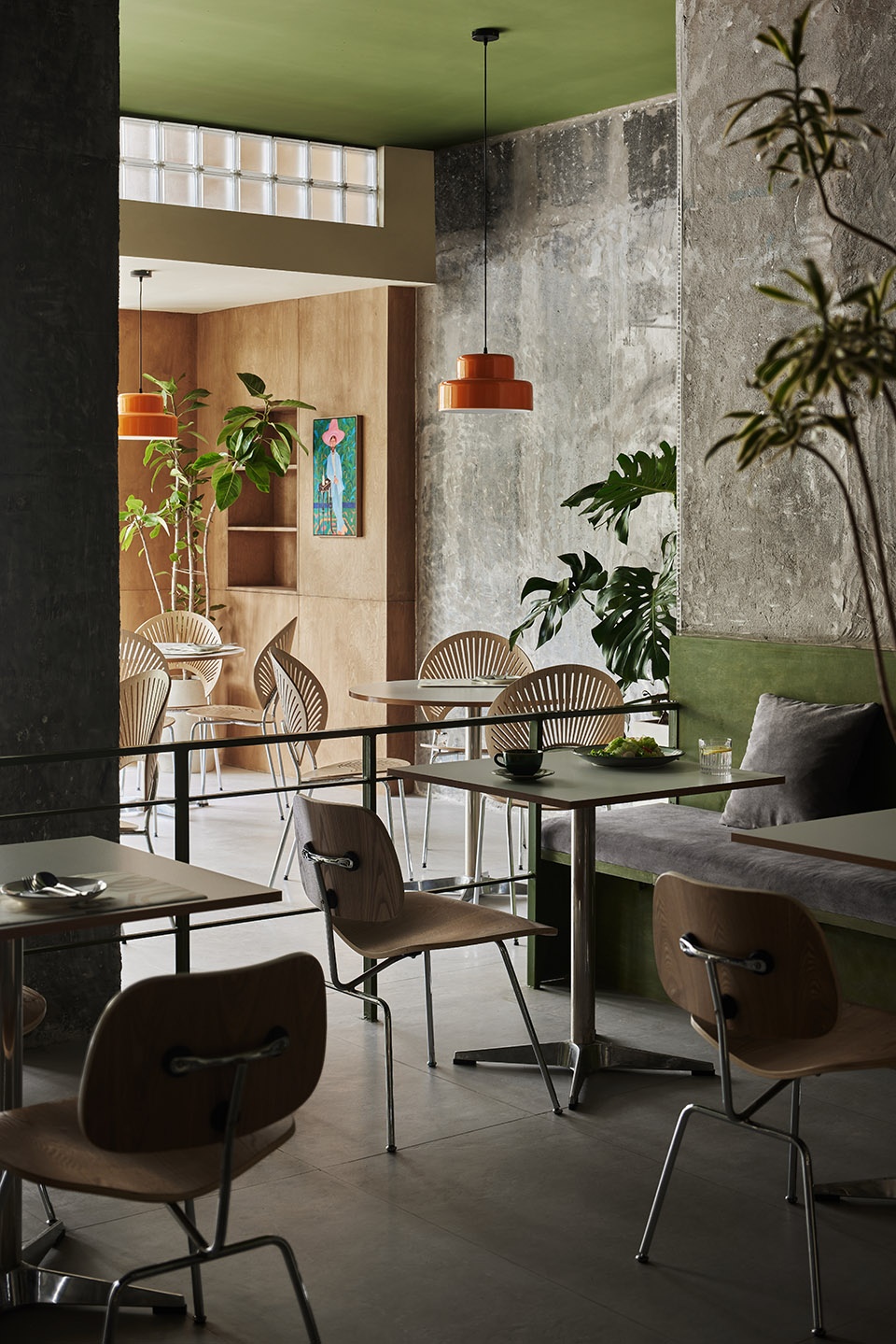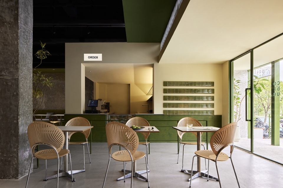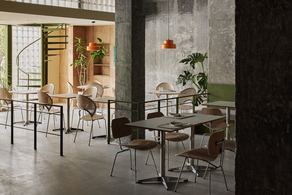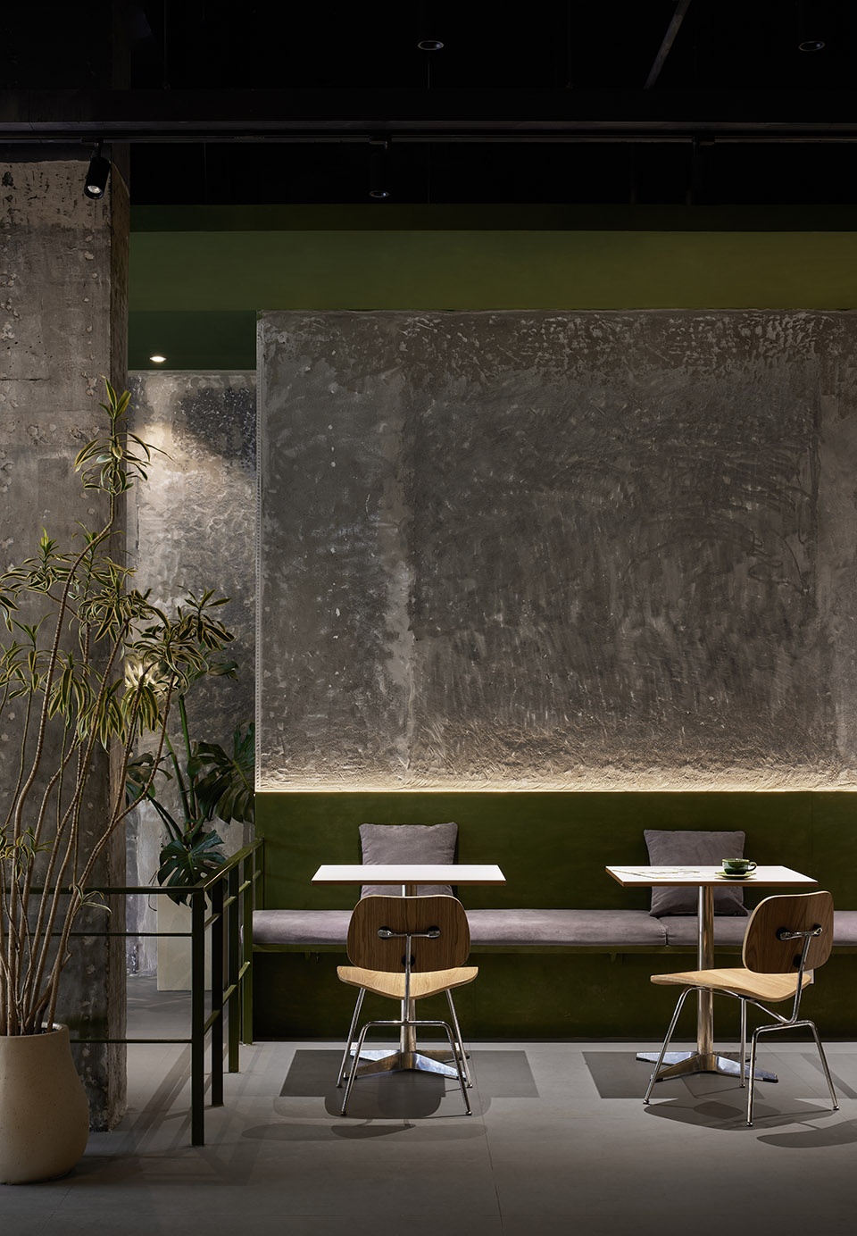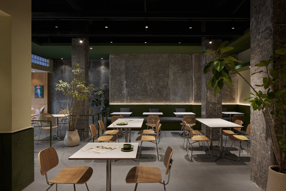 The spatial structure presents openness, with concrete and cement paving as the base colour of the space, and the natural texture of the space is enhanced by the colour of logs and green. The visual hierarchy is presented through different materials and textures of different thicknesses.The original load-bearing structure is retained, and the bare cement column presents natural beauty, free and smooth moving line layout, while maintaining an effective and comfortable distance between people and tables. You can enjoy healthy food and cosy social interaction no matter where you are indoors.