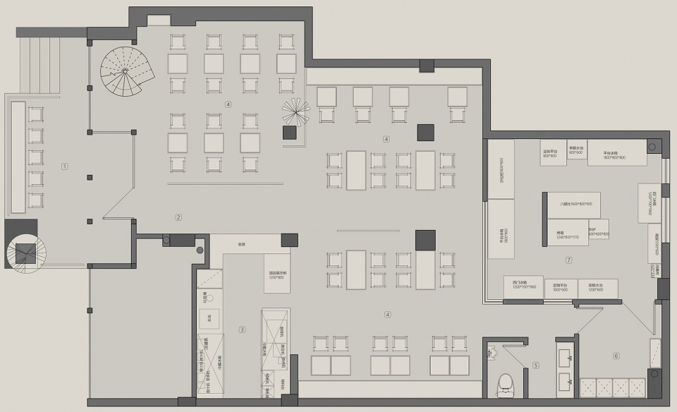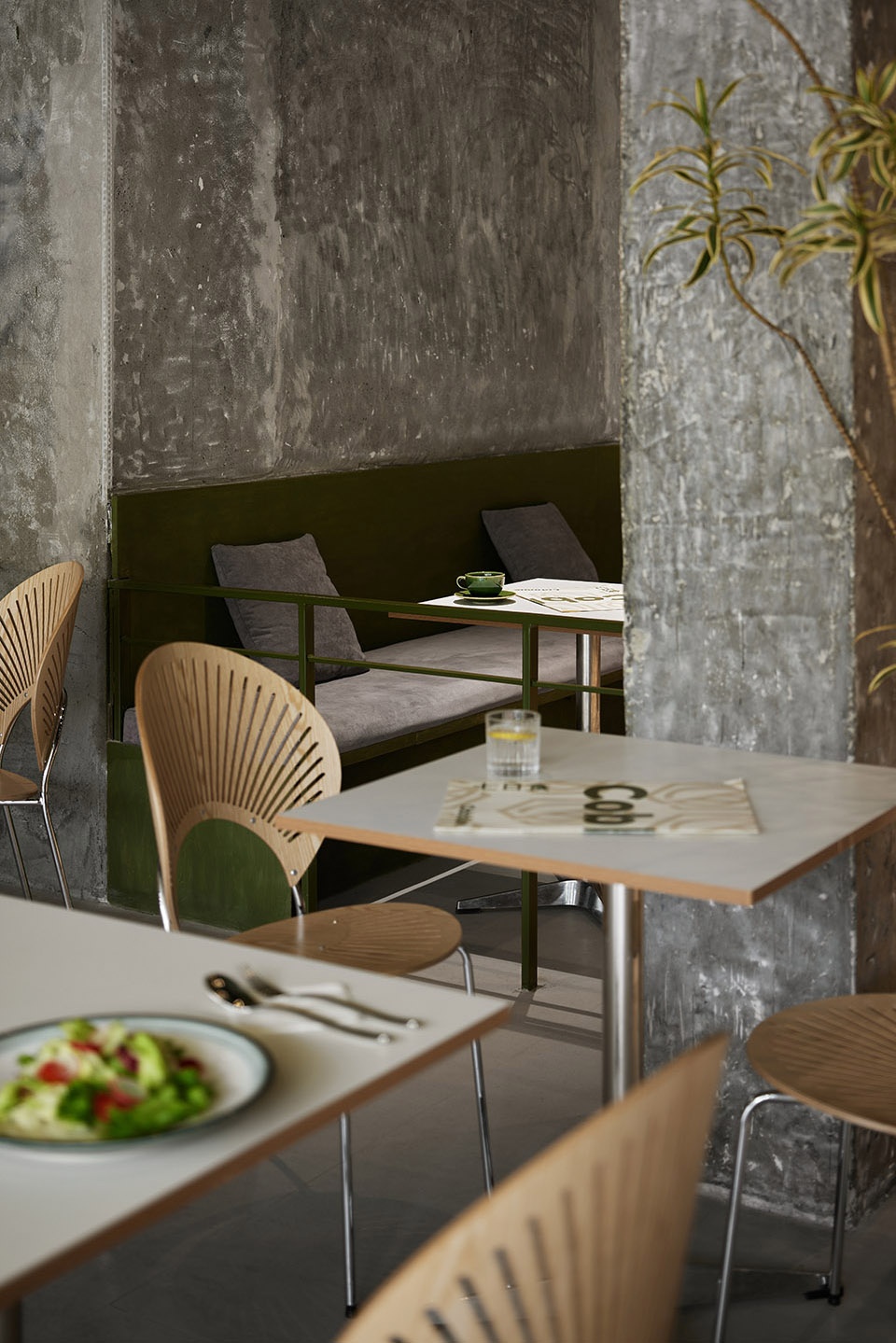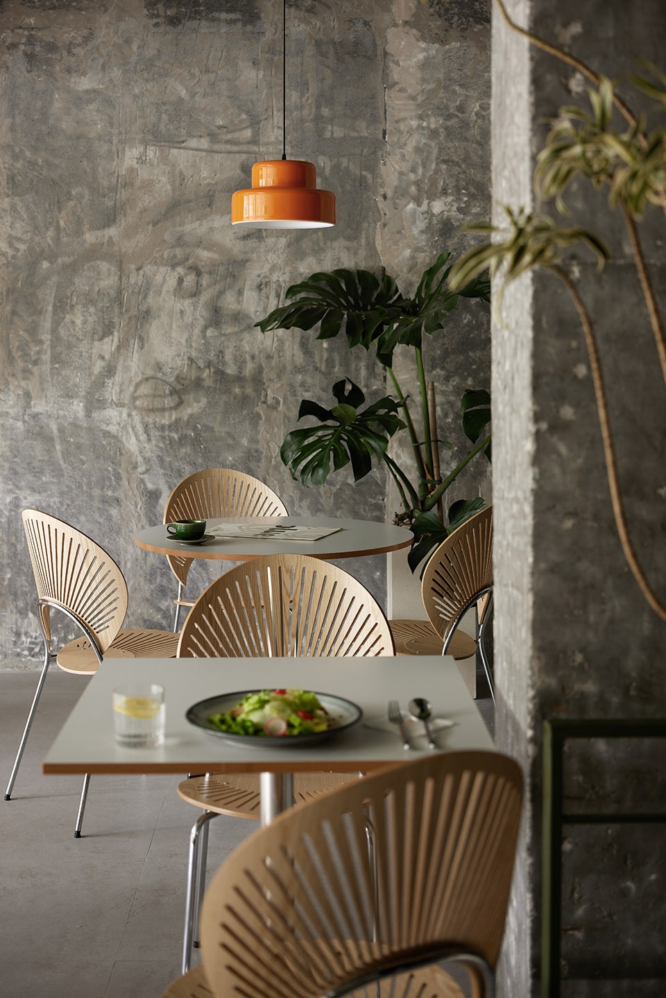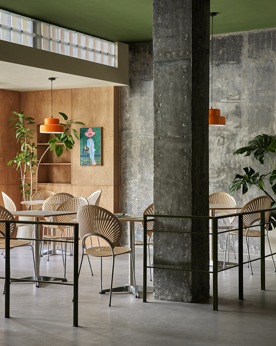 The spatial structure presents openness, with concrete and cement paving as the base colour of the space, and the natural texture of the space is enhanced by the colour of logs and green. The visual hierarchy is presented through different materials and textures of different thicknesses.The original load-bearing structure is retained, and the bare cement column presents natural beauty, free and smooth moving line layout, while maintaining an effective and comfortable distance between people and tables. You can enjoy healthy food and cosy social interaction no matter where you are indoors.