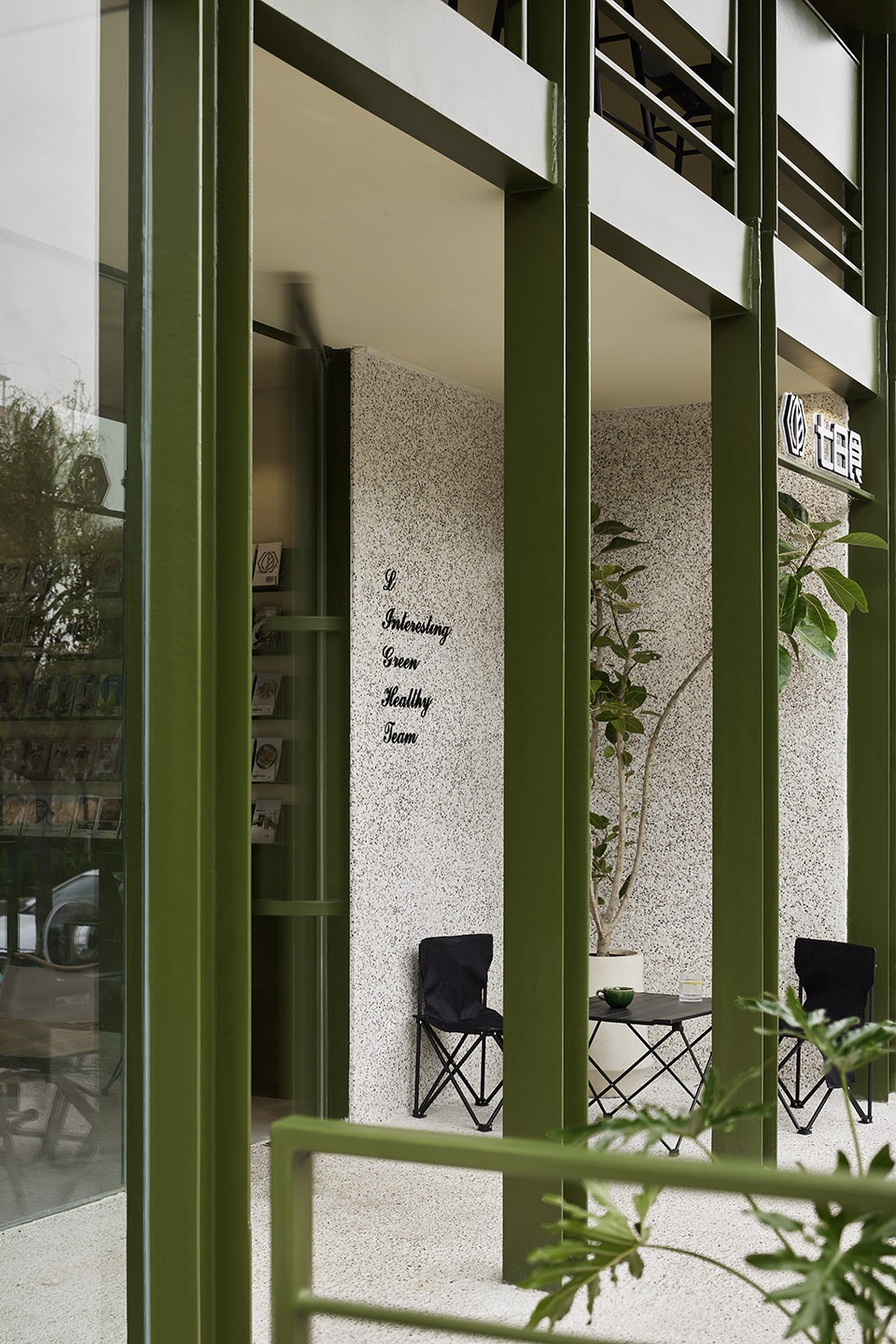 门头设计以原始结构为基础,绿色框架开放式布局,选用大面积落地窗组合而成,最大限度的将光线与视野引入室内,轻盈的外立面充分呈现出健康、年轻、随性的表达。户外摆放着休闲椅,热闹街道的人来人往,吹着湖边清凉的微风,自觉代入露营风的舒适与自在。将茂盛的自然植被引入室内,与湖边四季遥相呼应,在此,享受时光的流转,细品生活的惬意。