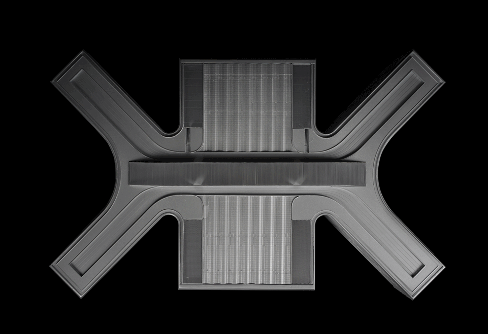 在矩形规整的方盒子体量中,通过交错、对话等形体变化,其结构本身也是具有趣味性的空间景观,打破冗长的流线,融入共享枢纽。
