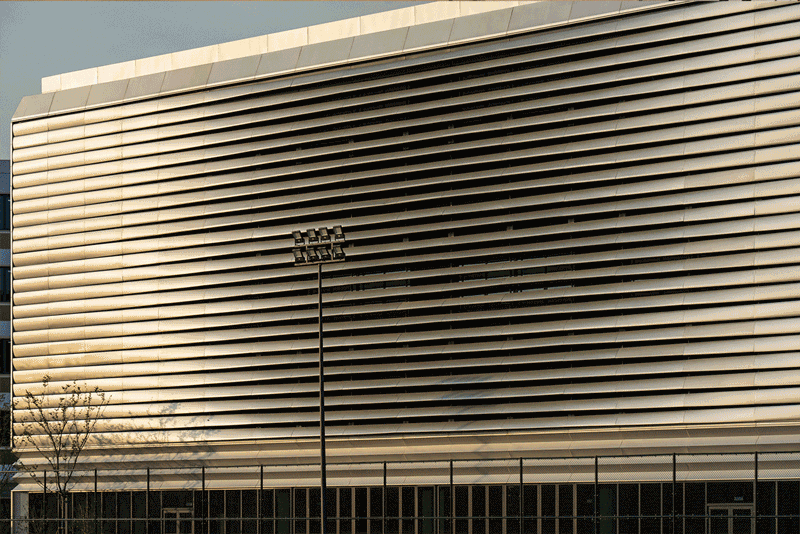 The east and west facades of the main campus use horizontally perforated external sun shading louvers. By folding at a certain angle, multiple reflections of light are formed to ensure sufficient and uniform soft light in the gymnasium.