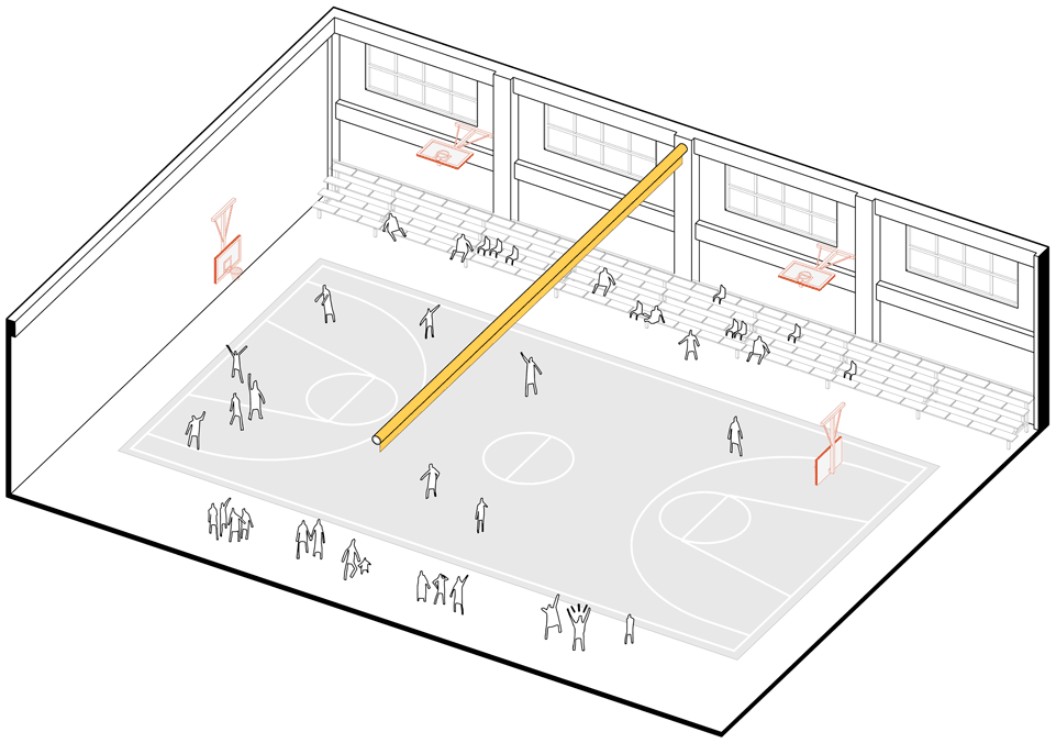Hub枢纽的西部依次容纳25m*6泳道的游泳馆(1F)、小学体育馆(2-3F)和中学体育馆(4-5F)。体育馆的空间尺寸分别按照中小学生的身体尺度进行规划,其中,小学部体育馆在剖面上分离出一层室内活动室兼做室内看台。中学部体育馆含两个标准篮球场尺寸,以体育竞技为标准设计。