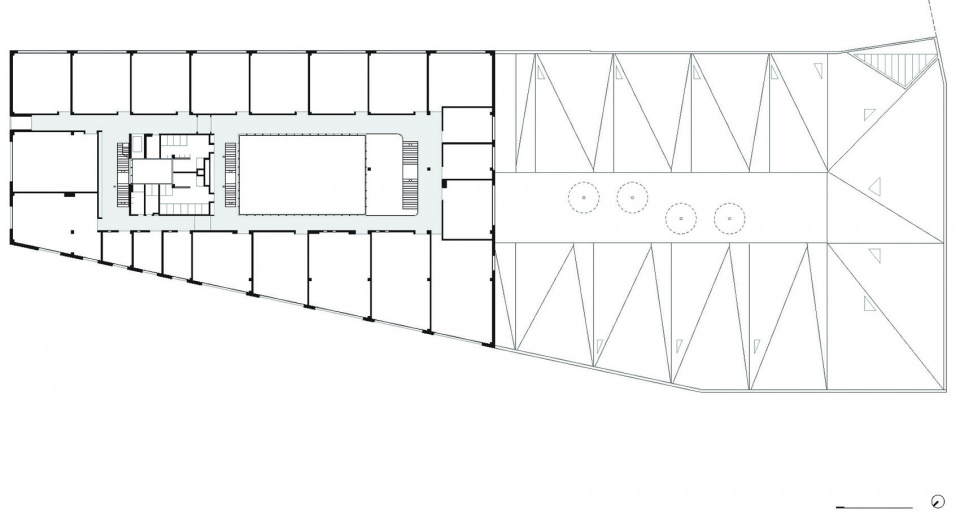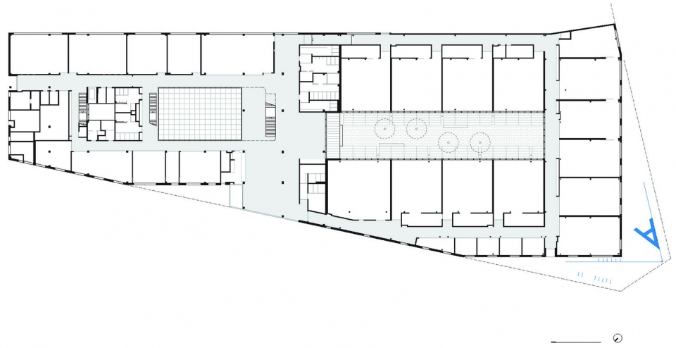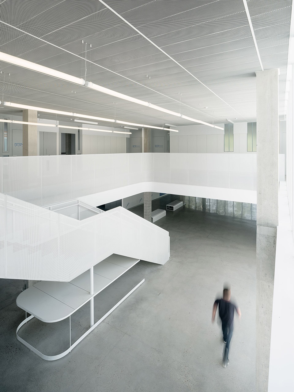 建筑的门厅是不同空间之间的交汇点,也是一个不同学科汇集的地方。这里不仅调节了出入口,同时也成为了一个聚集的场所,图书馆和自助餐吧等公共项目都设置在这里。门厅空间的特点是有着能够与教室露台相连接的双层层高。教室露台可以举办会议和活动。