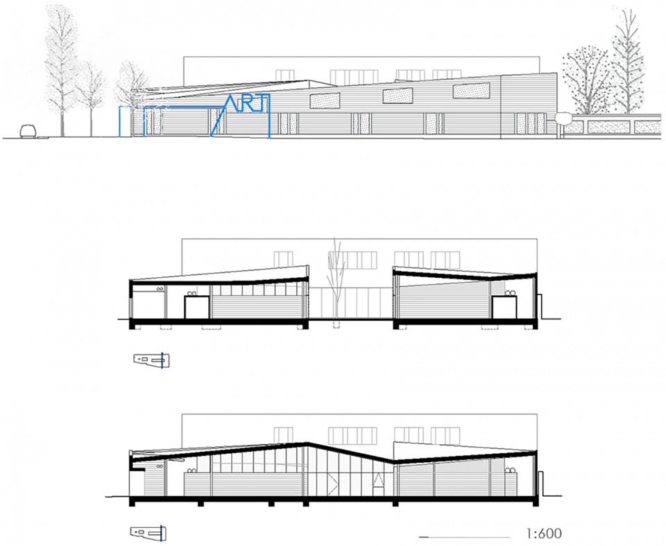 Taking advantage of the location of the building in relation to the urban fabric, a small welcoming square is gifted to the city. This creates a meeting space for young people, but also for the citizens. The small square, with oversized letters forming the ART sign, will allow the students to sit down to chat, eat a sandwich or have fun. Given its location in the street, it becomes part of the public space, activating the architecture. The building configures a background, and the students themselves the activity that will act as claim for the rest of the city.