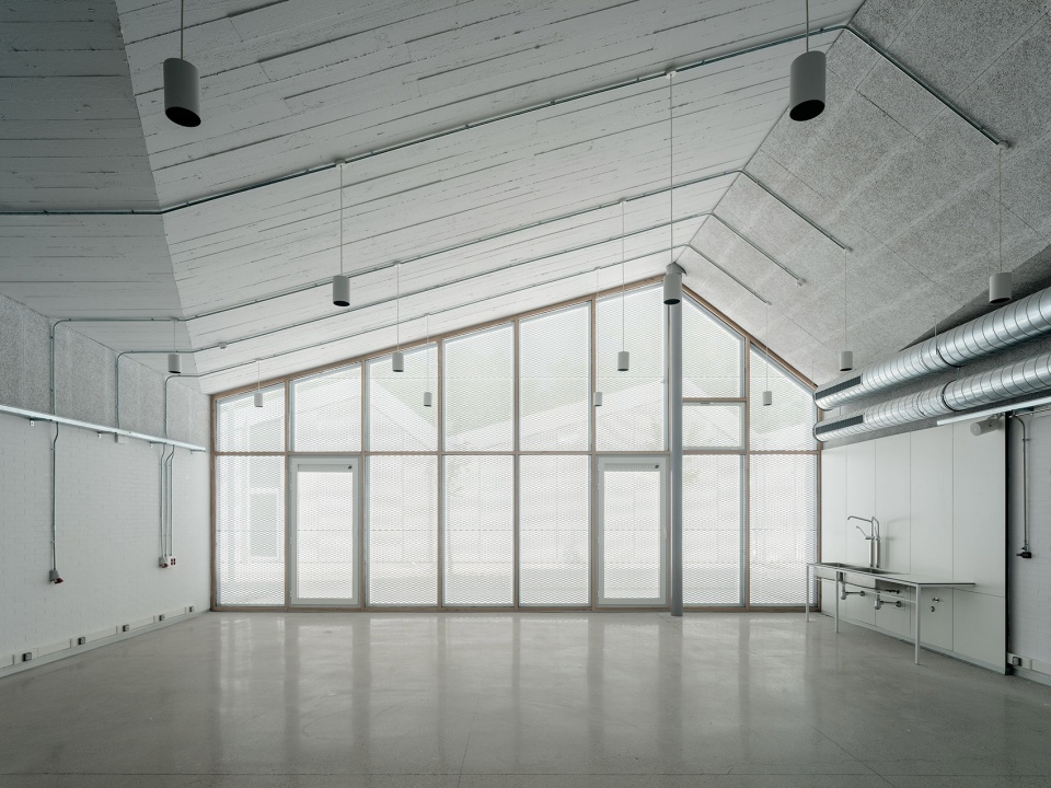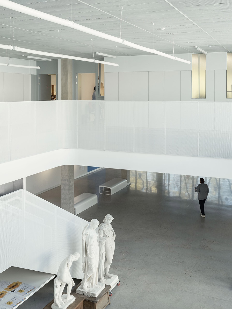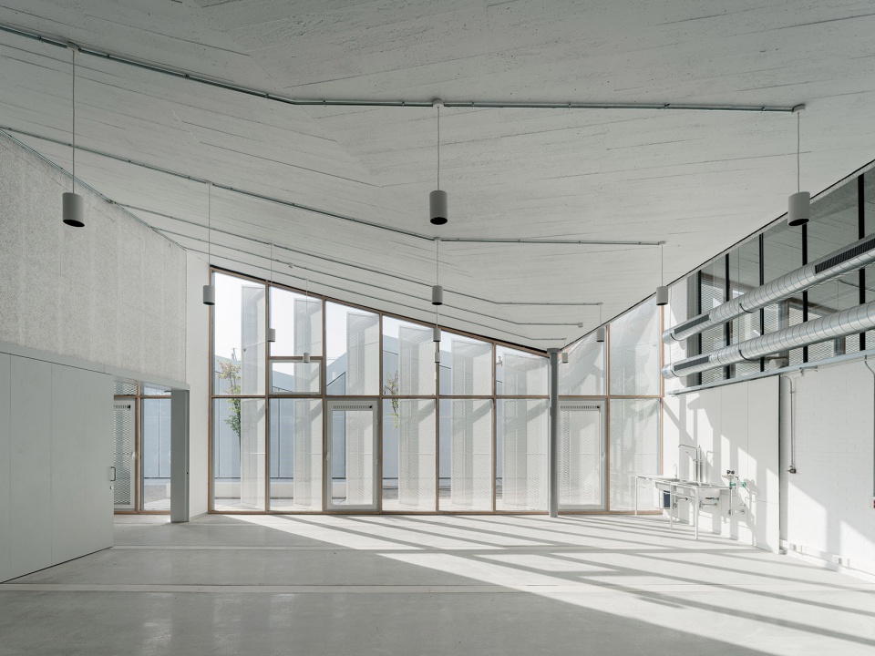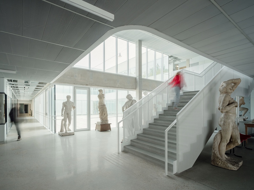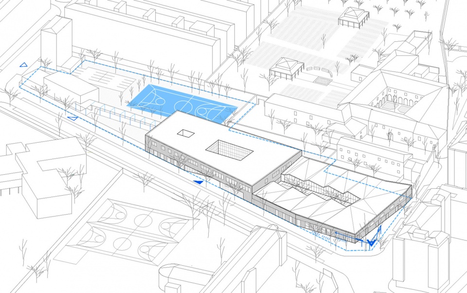 受到旁边修道院的启发,项目模仿了庭院建筑的布局。第一个庭院在层次上连接了教室区域,另一个稍大一点的庭院在被折叠的混凝土外壳下方组织了工作室空间。混凝土外壳的立面被压缩成直线型,在庭院中呈现出一个碎片化的轮廓,从而形成俯瞰庭院的大窗户。设计者想象学生们在这个中央空间中分享他们的经历,这个空间也成为了年轻的、充满活力且多才多艺的创作集会地。该庭院的设计打破传统,可以用作展览、玩耍和相互交流的空间。