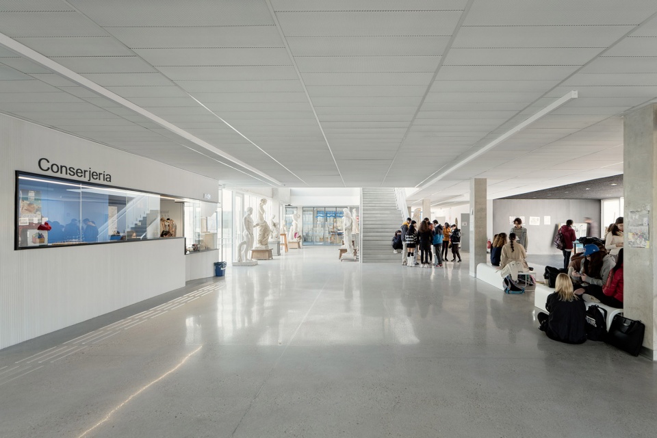 The lobby is the point of intersection between the different users of the building; the place where the diverse artistic disciplines come together. It regulates the entrance and exit, but also becomes a meeting place, where common programs such as the library or the cafeteria are located. This space features a double height associated to the classroom’s patio, where meetings and events can be held.