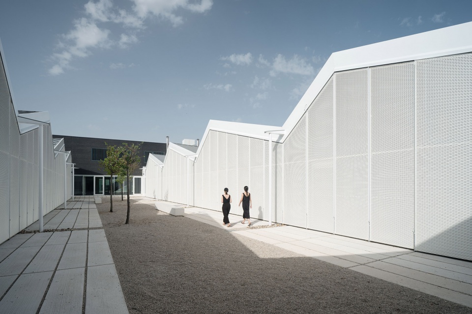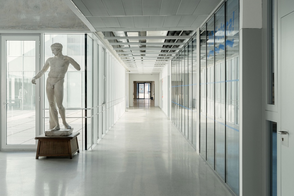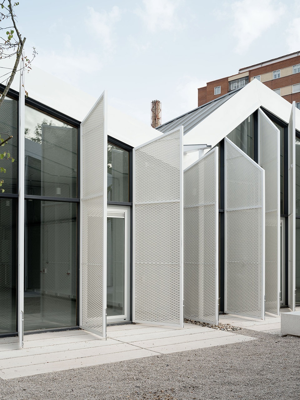The layout mimics the courtyard architecture, inspired by the adjoining convent. The first of two courtyards articulates the classroom area on two levels, while the other, slightly larger, organizes the workshops under a folded concrete shell. The shell is constricted into a straight outline in the façade, folding into itself as it falls into the courtyard, creating a broken profile, resulting in large windows that overlook the patio. We imagine students sharing their experiences in this central space, as an agora for young, dynamic and versatile creation. The patios can be spaces to exhibit, play or interact, updating this traditional typology.