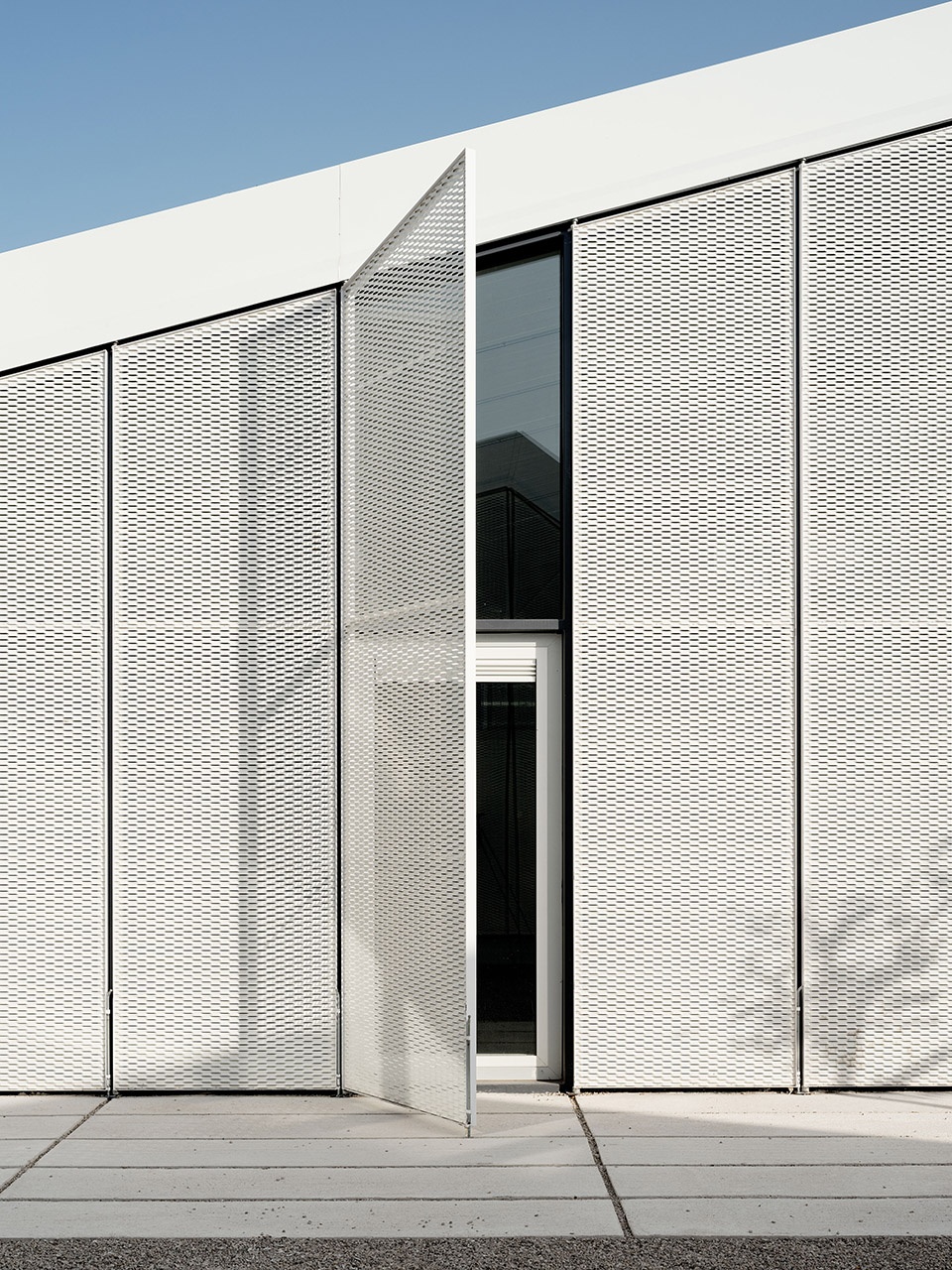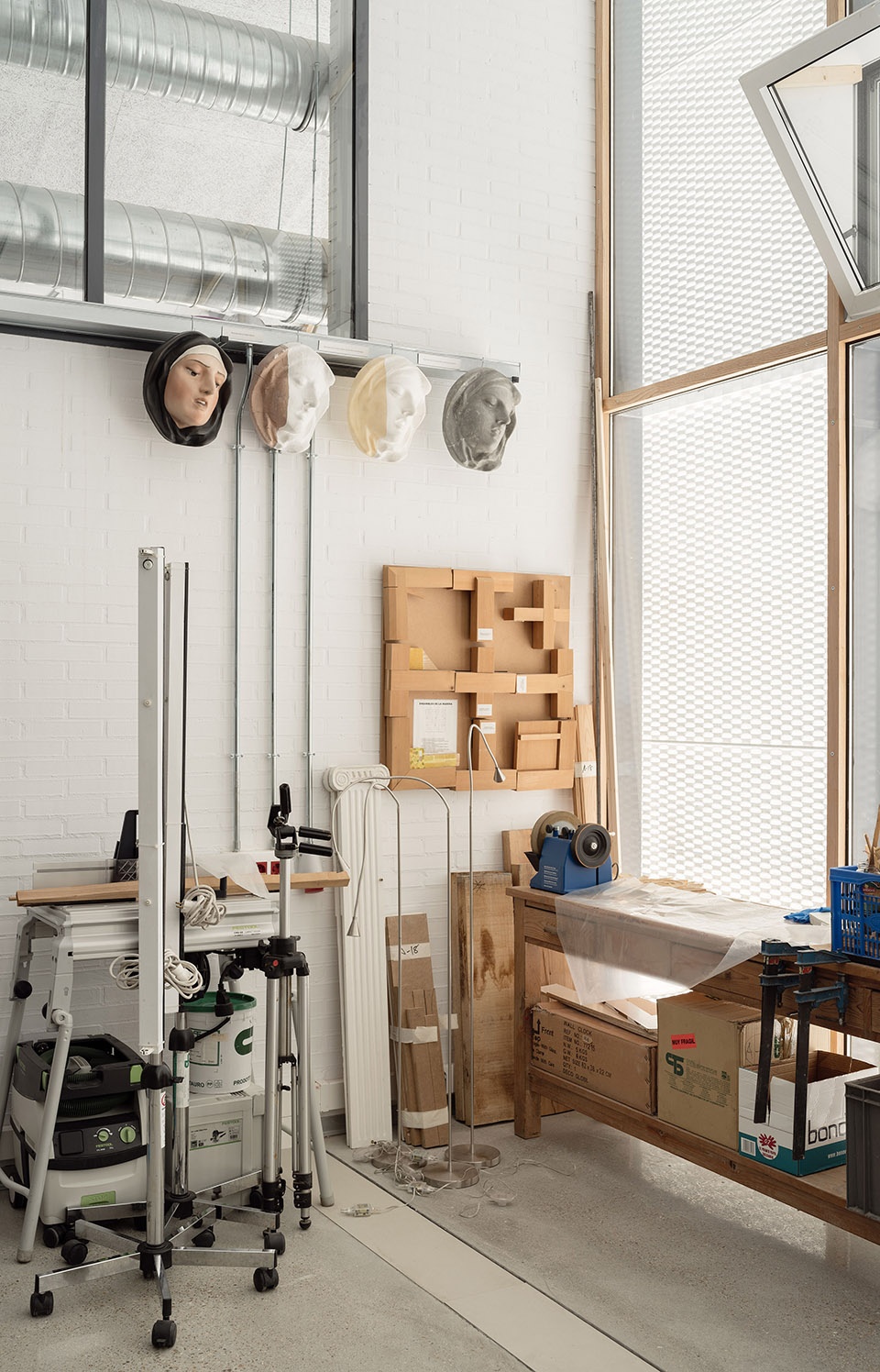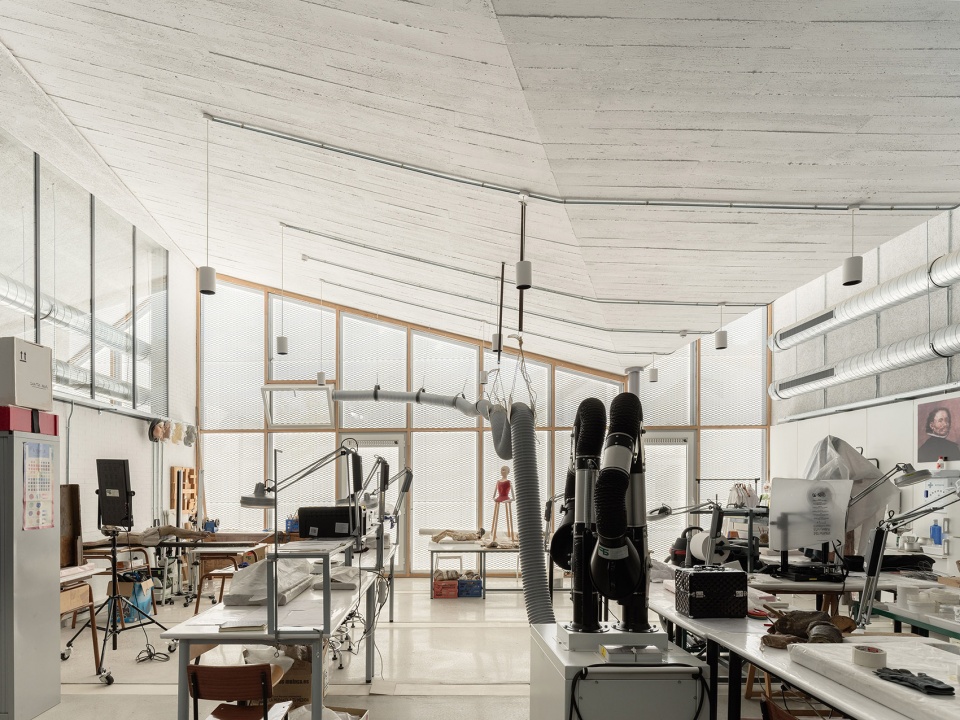 The exterior is clad in black brick; an architecture of texture, materiality and colour, which creates a sort of mystifying atmosphere that surrounds and protects the inner world of creation. The interior is thought of, by opposition, as a technological space, white and bright with formal allusions to industrial architecture, production and creation.